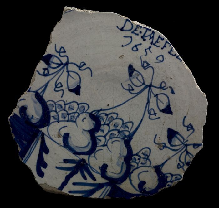 Ziel van majolica schotel, waarop tekst en fruit, ge...