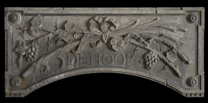 Fundatiesteen van distilleerderij, met druivenranken...