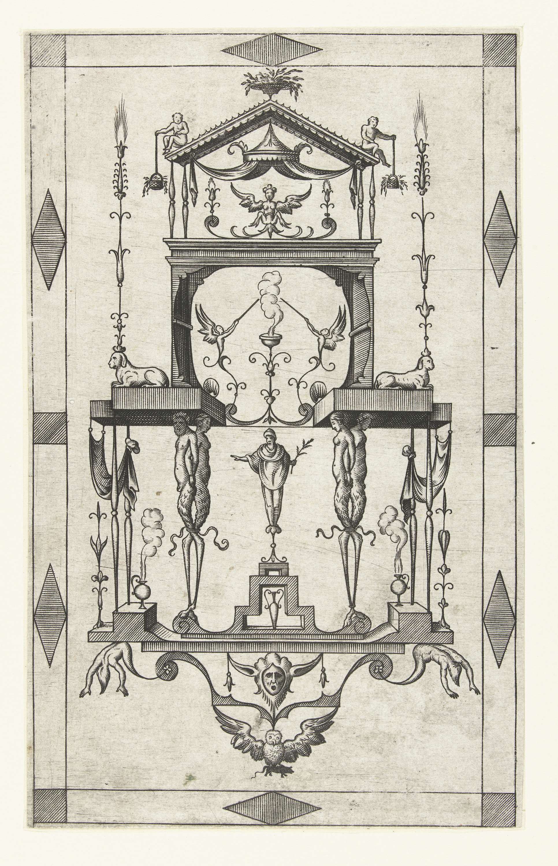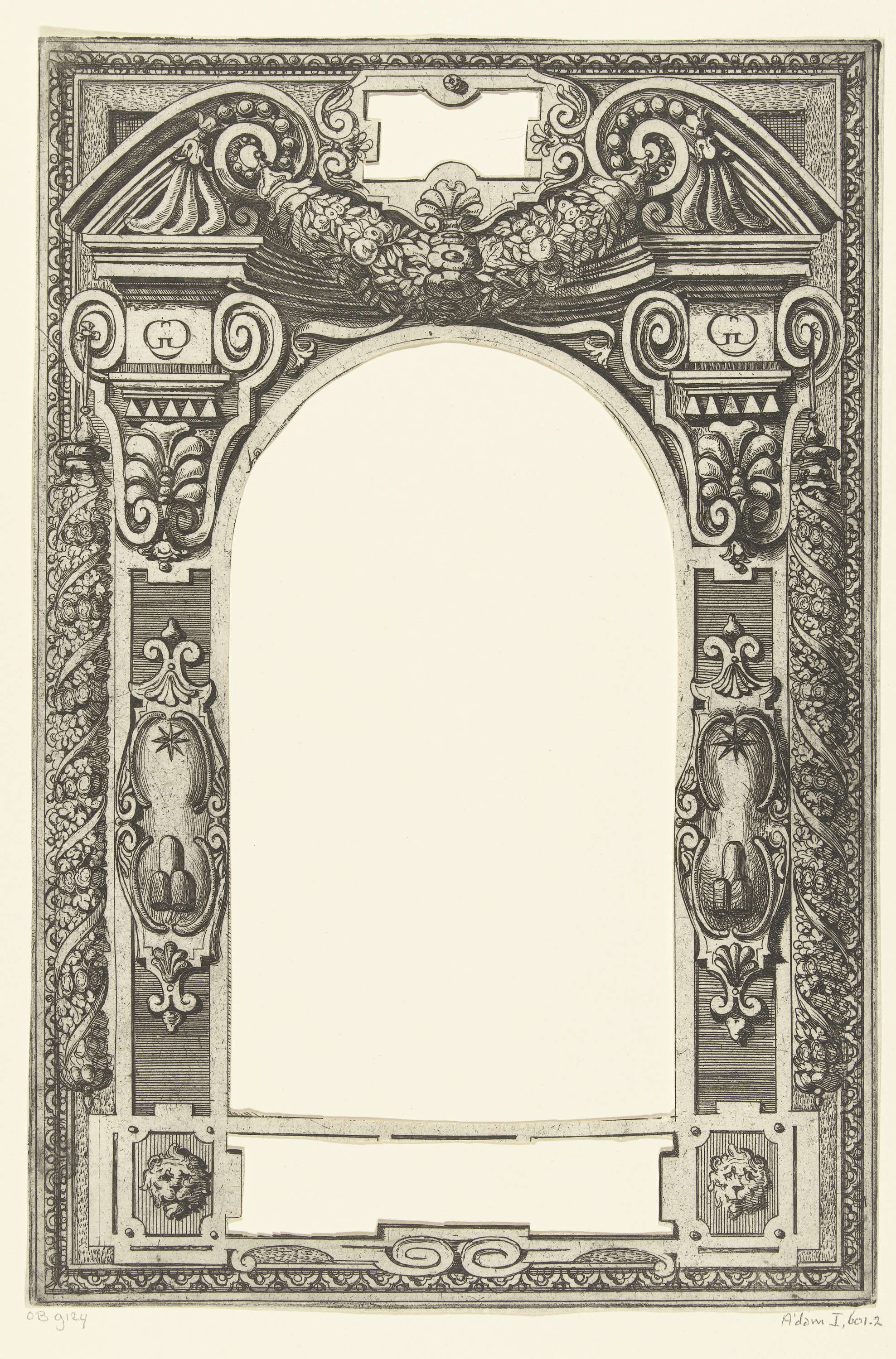 Fantasie-bouwwerk, onderaan gesteund door twee dubbe...