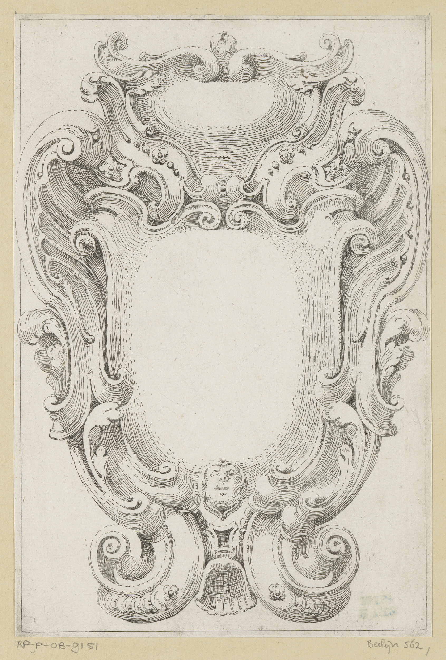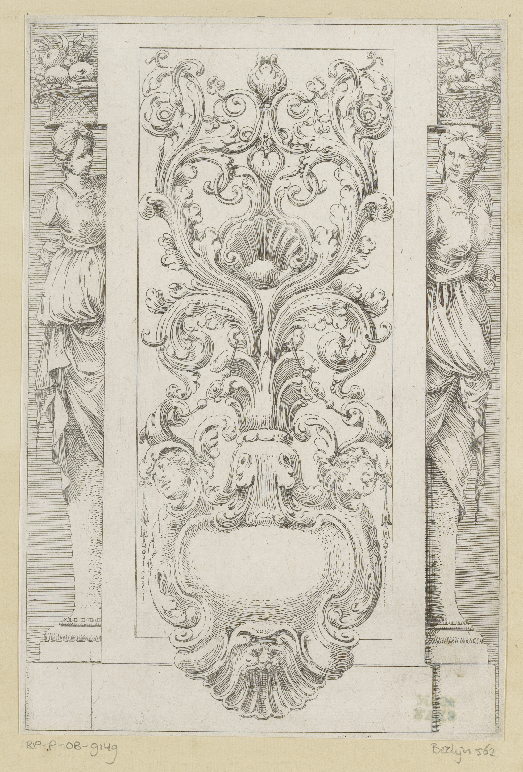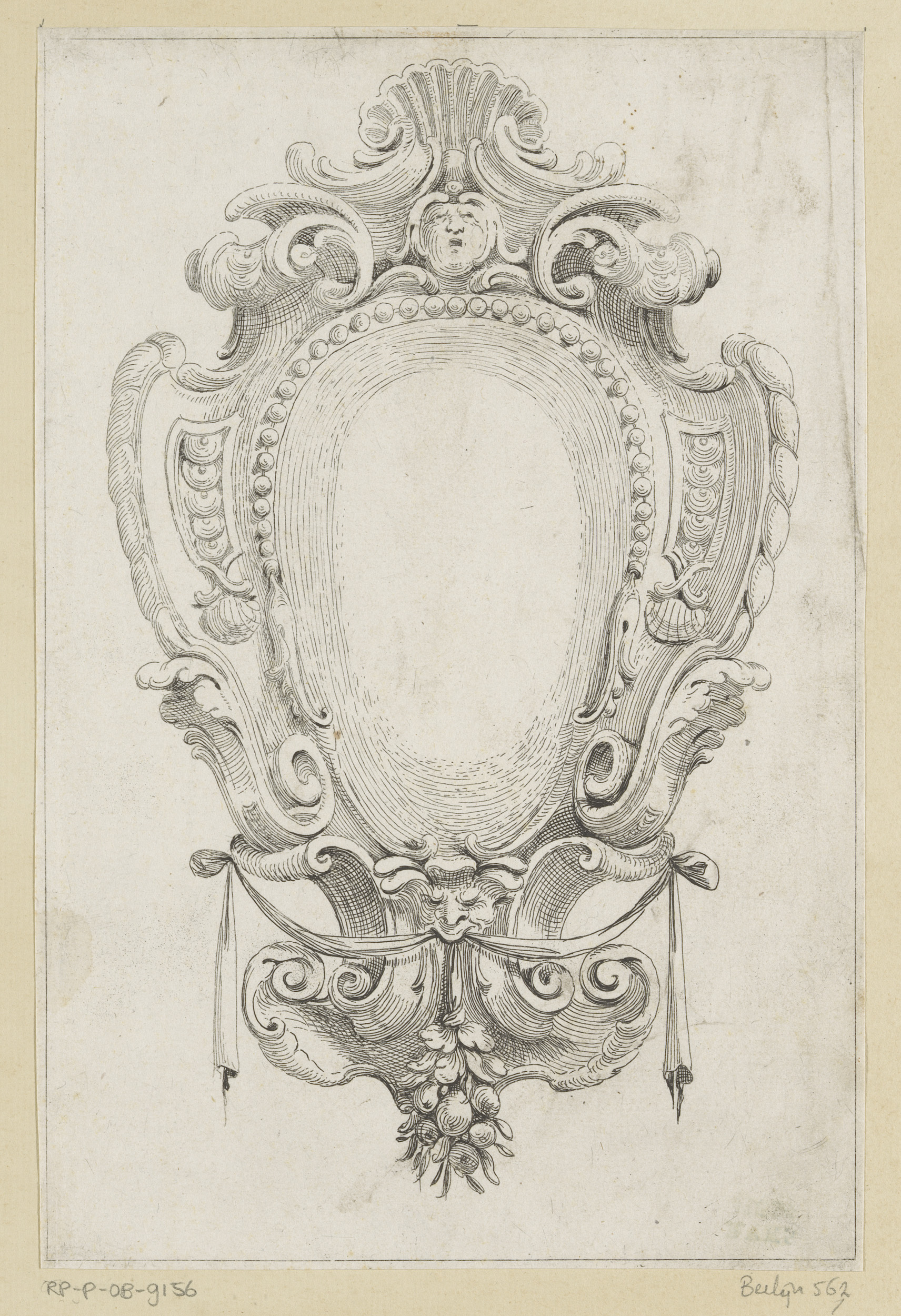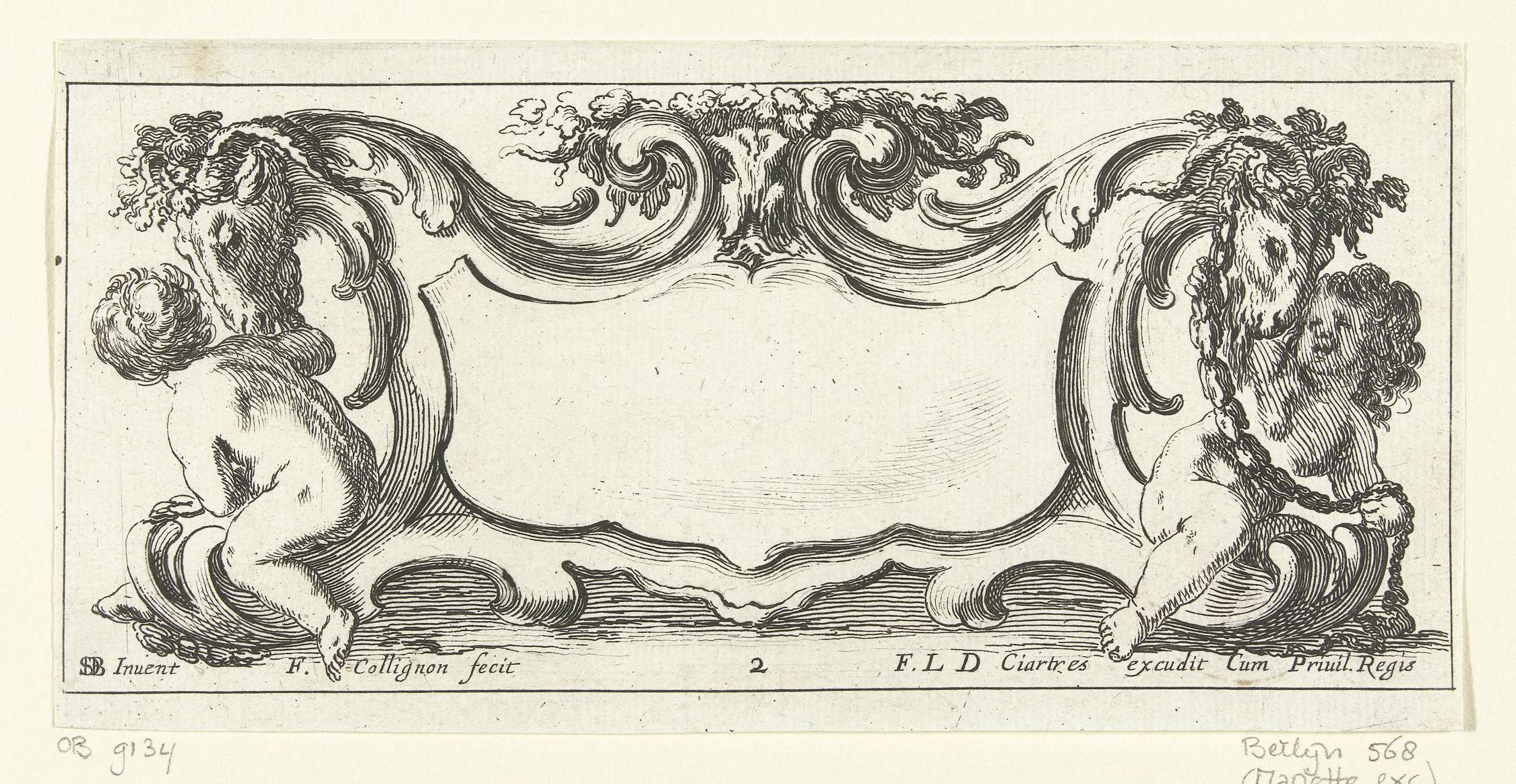 Cartouche met cherubijn en twee hoorns des overvloeds