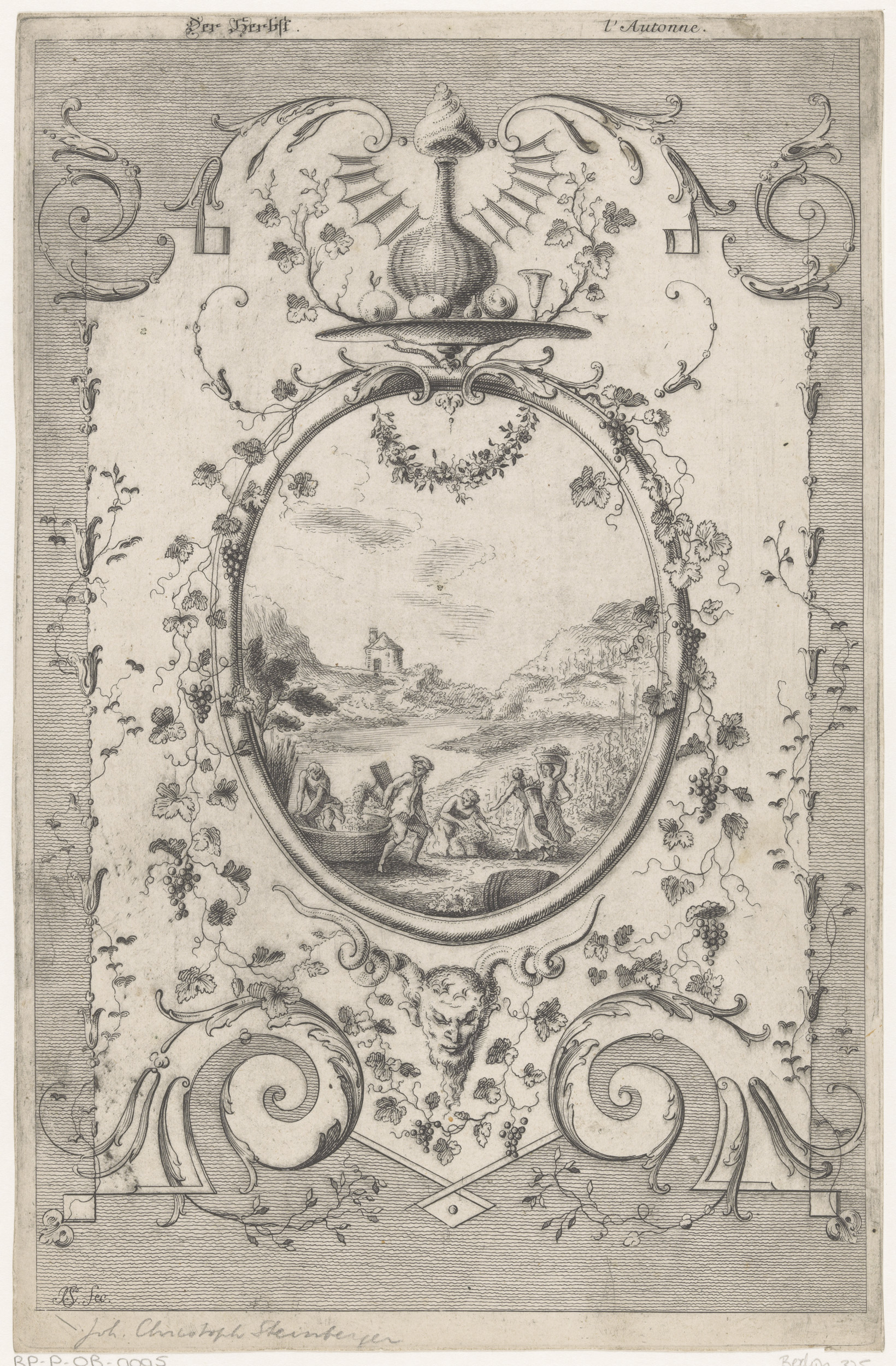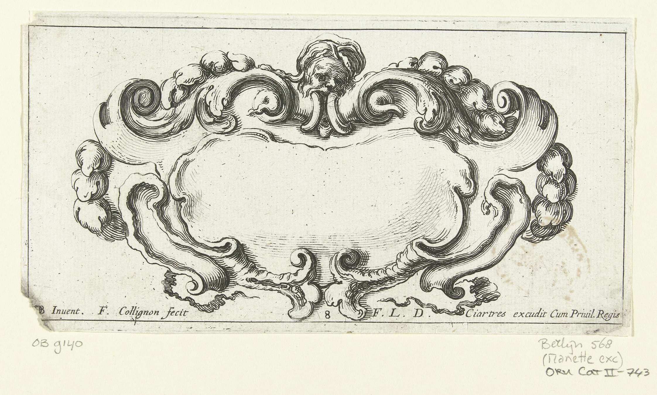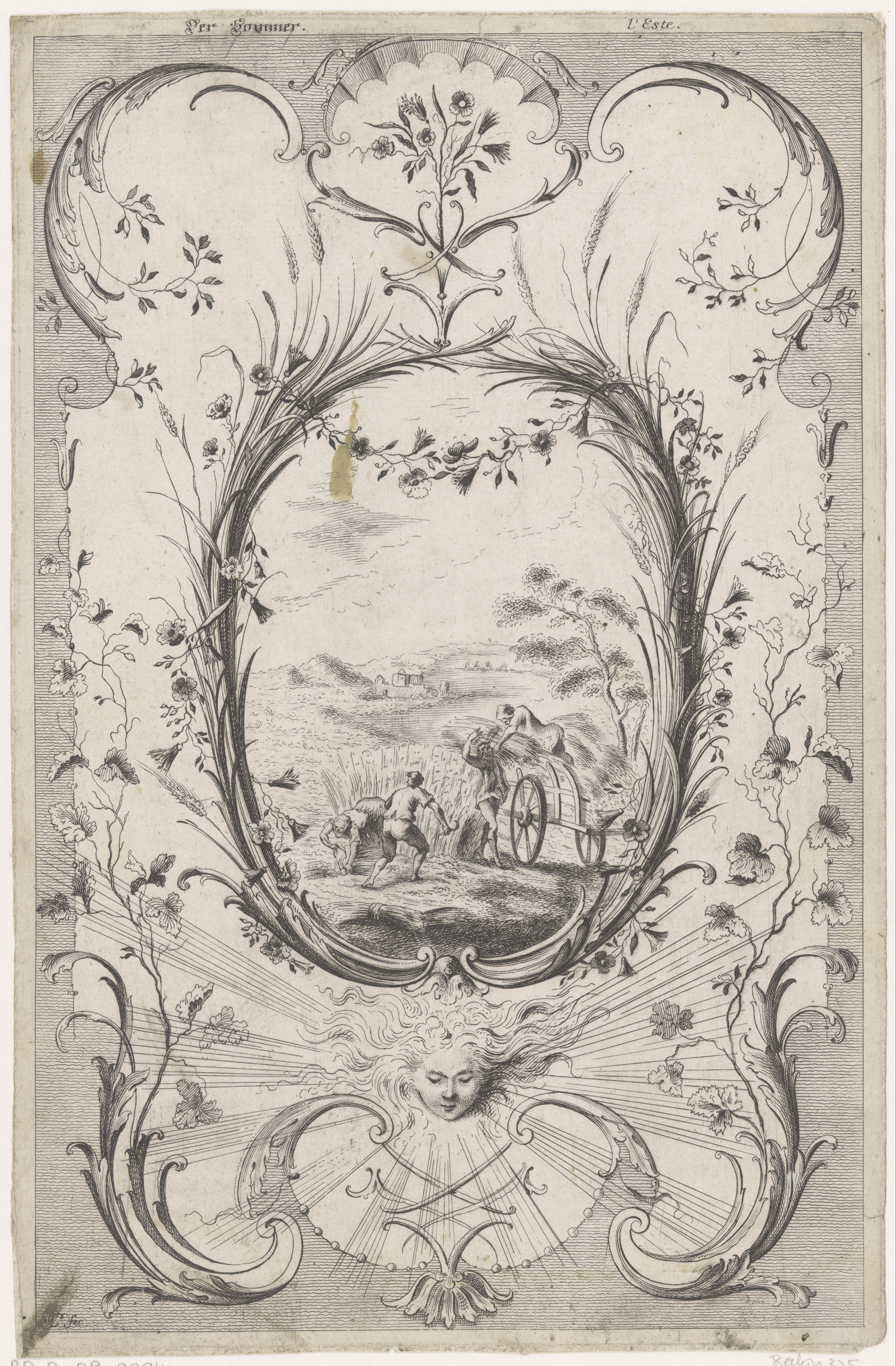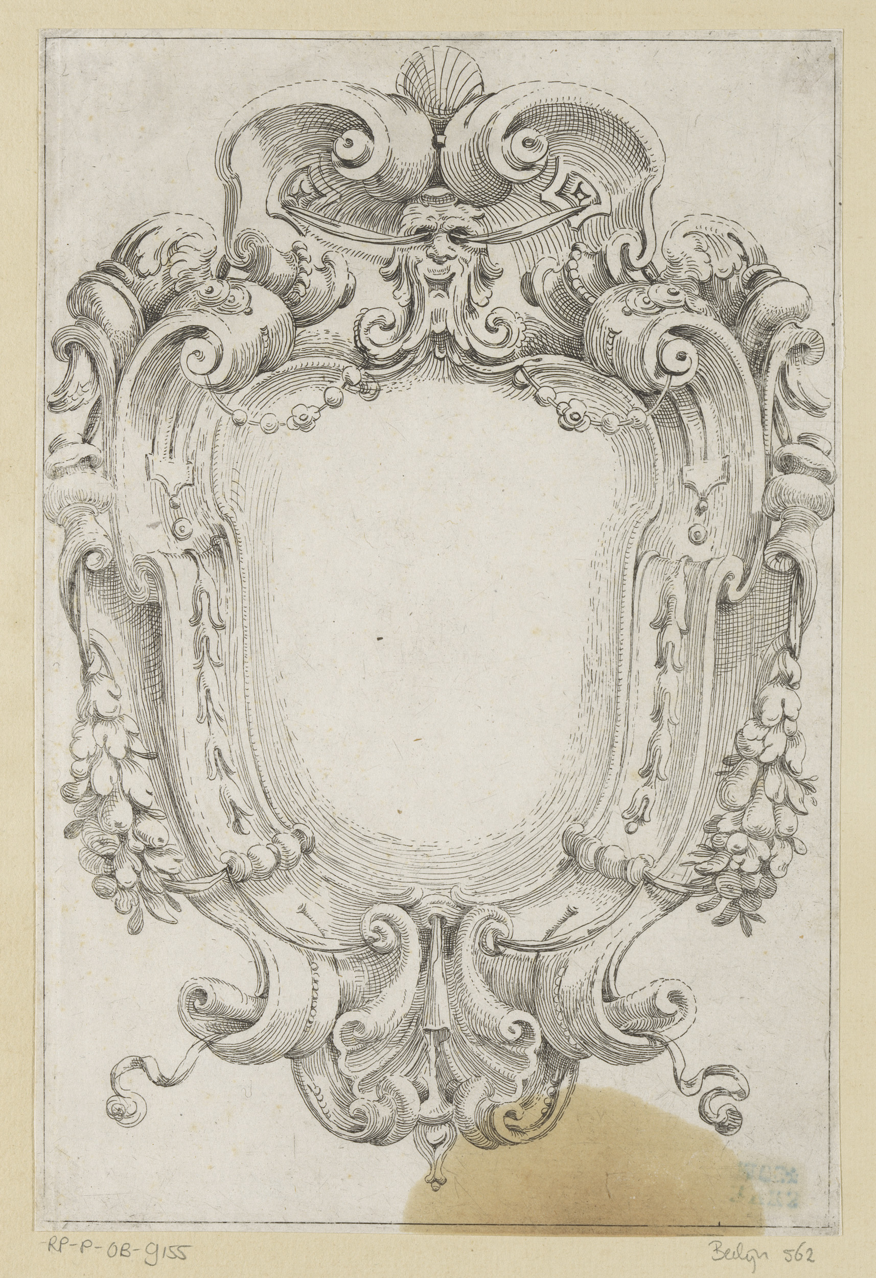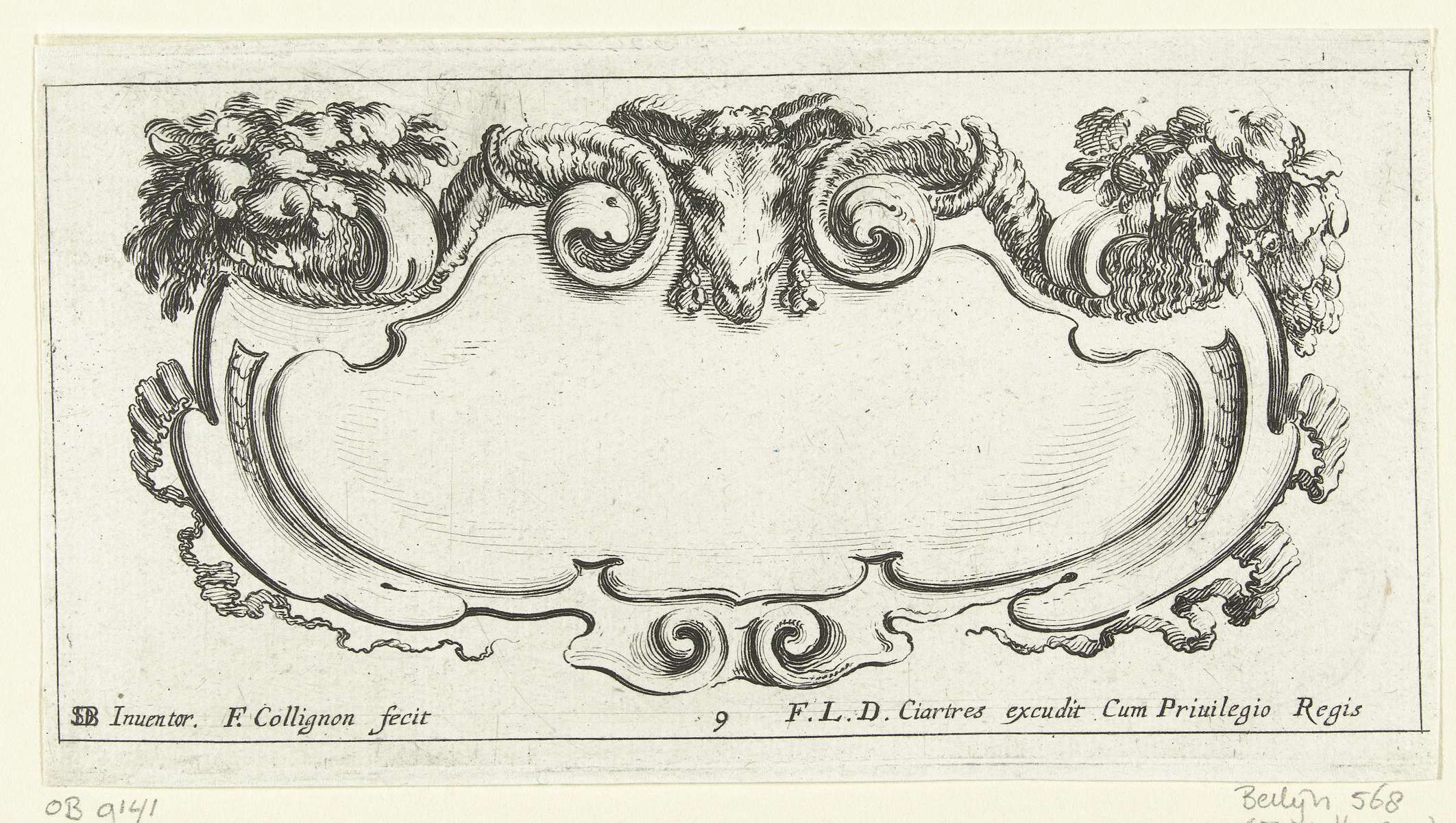 Cartouche met cherubijn en twee hoorns des overvloeds