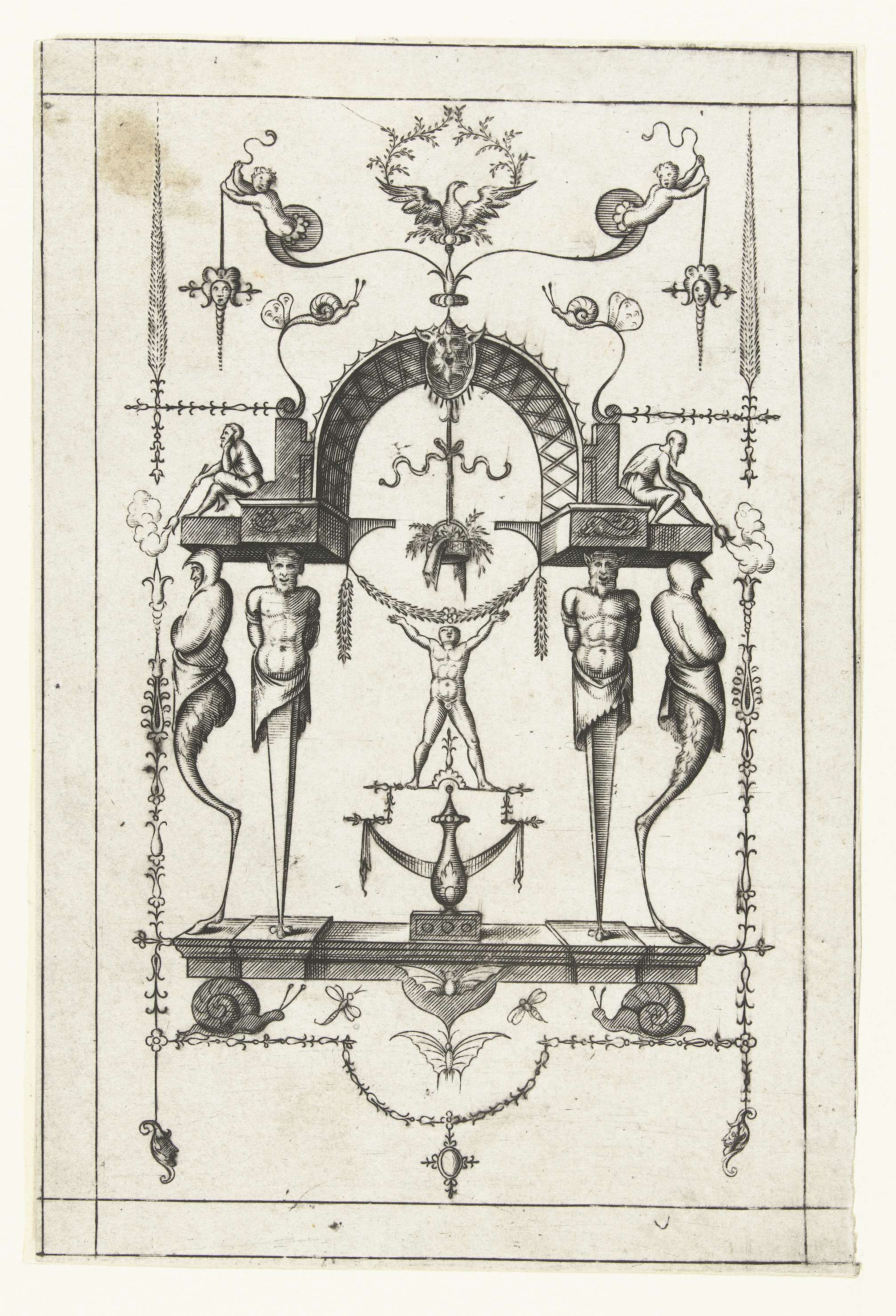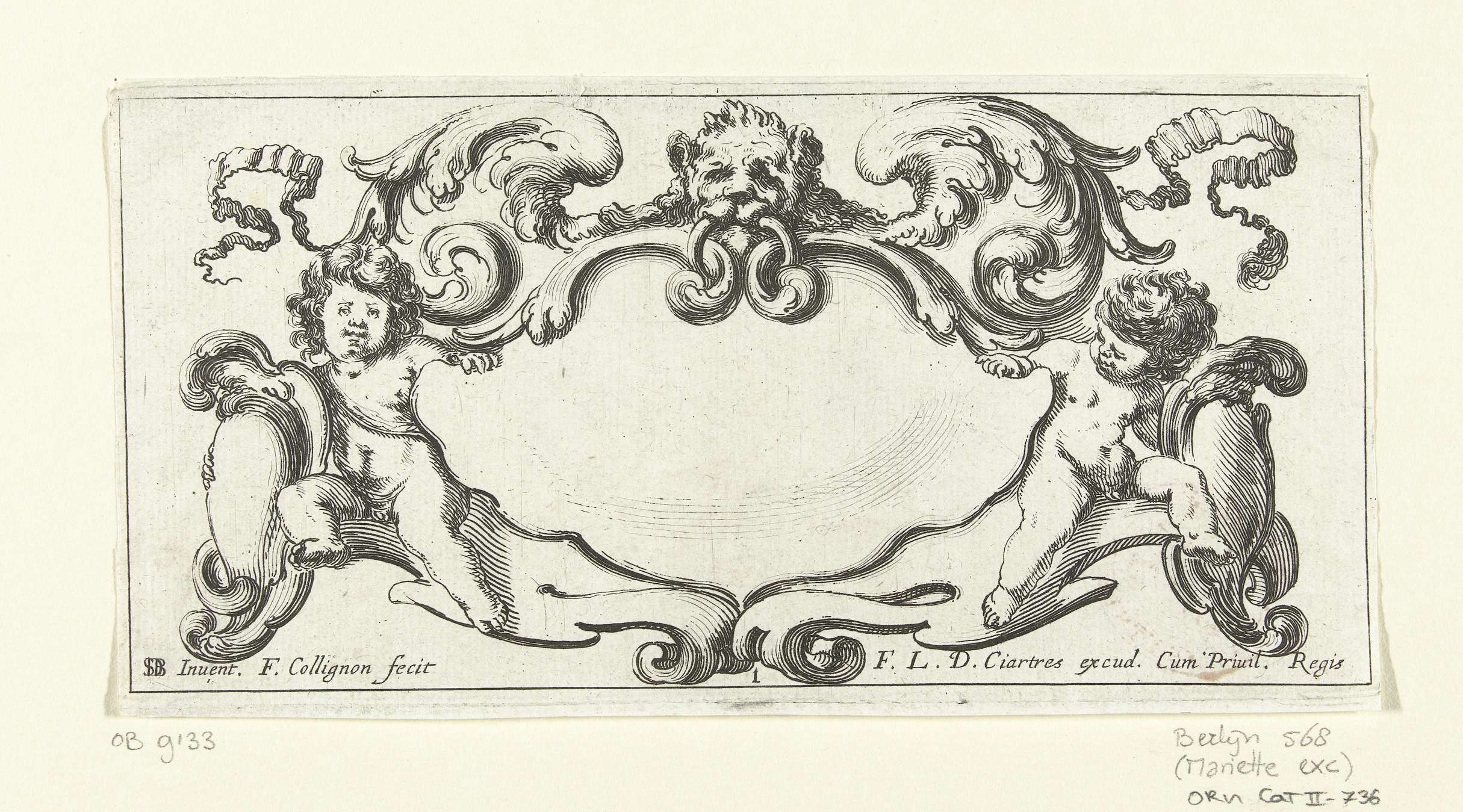 Cartouche met leeuwenkop en twee naakte jongens