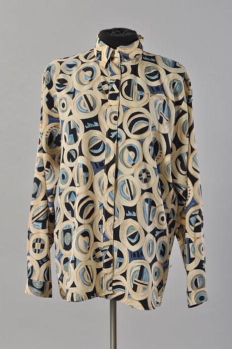 Satijnen damesblouse in beige-blauw geometrisch dess...