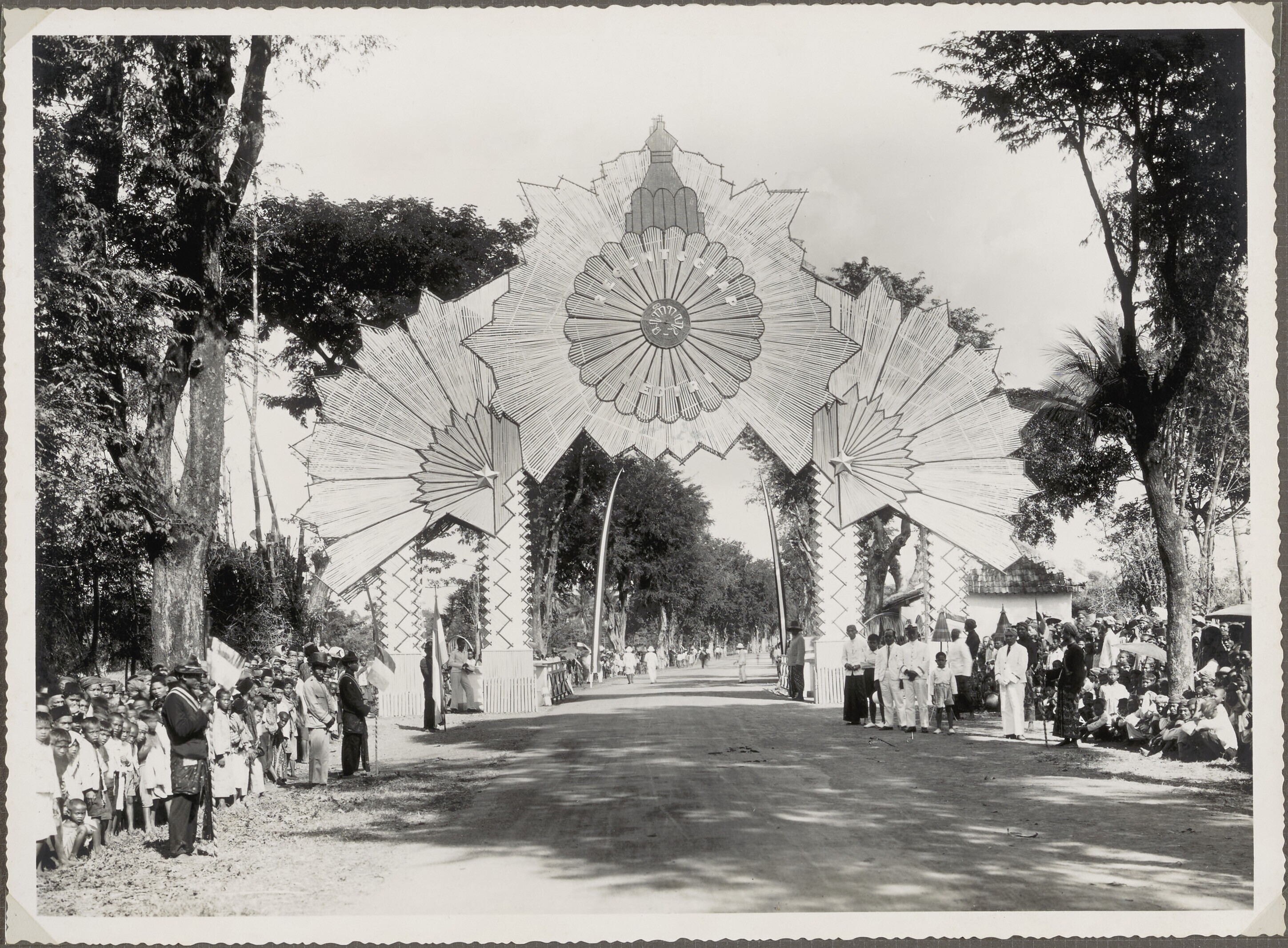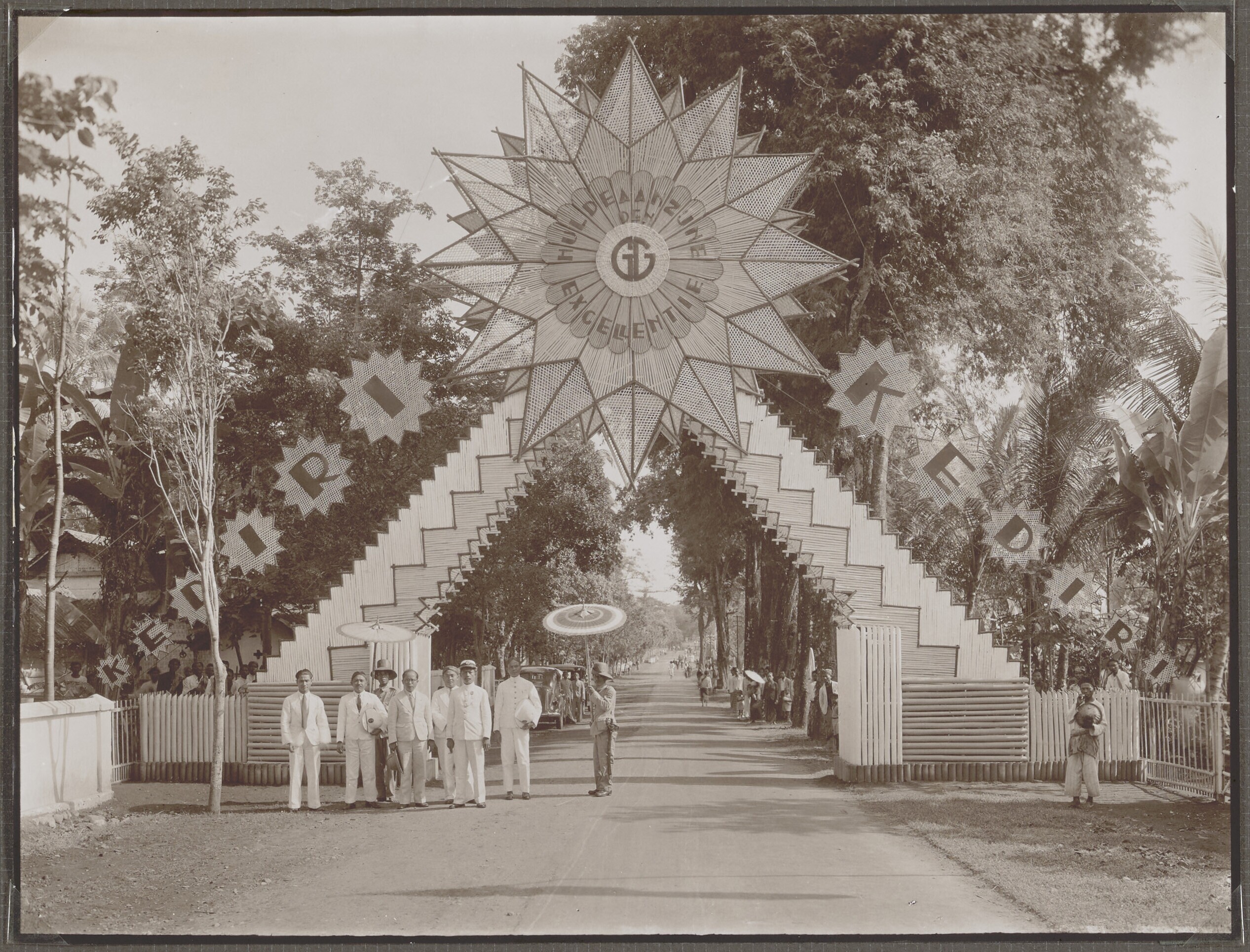 Ambtenaren bij een erepoort voor de ontvangst van Go...