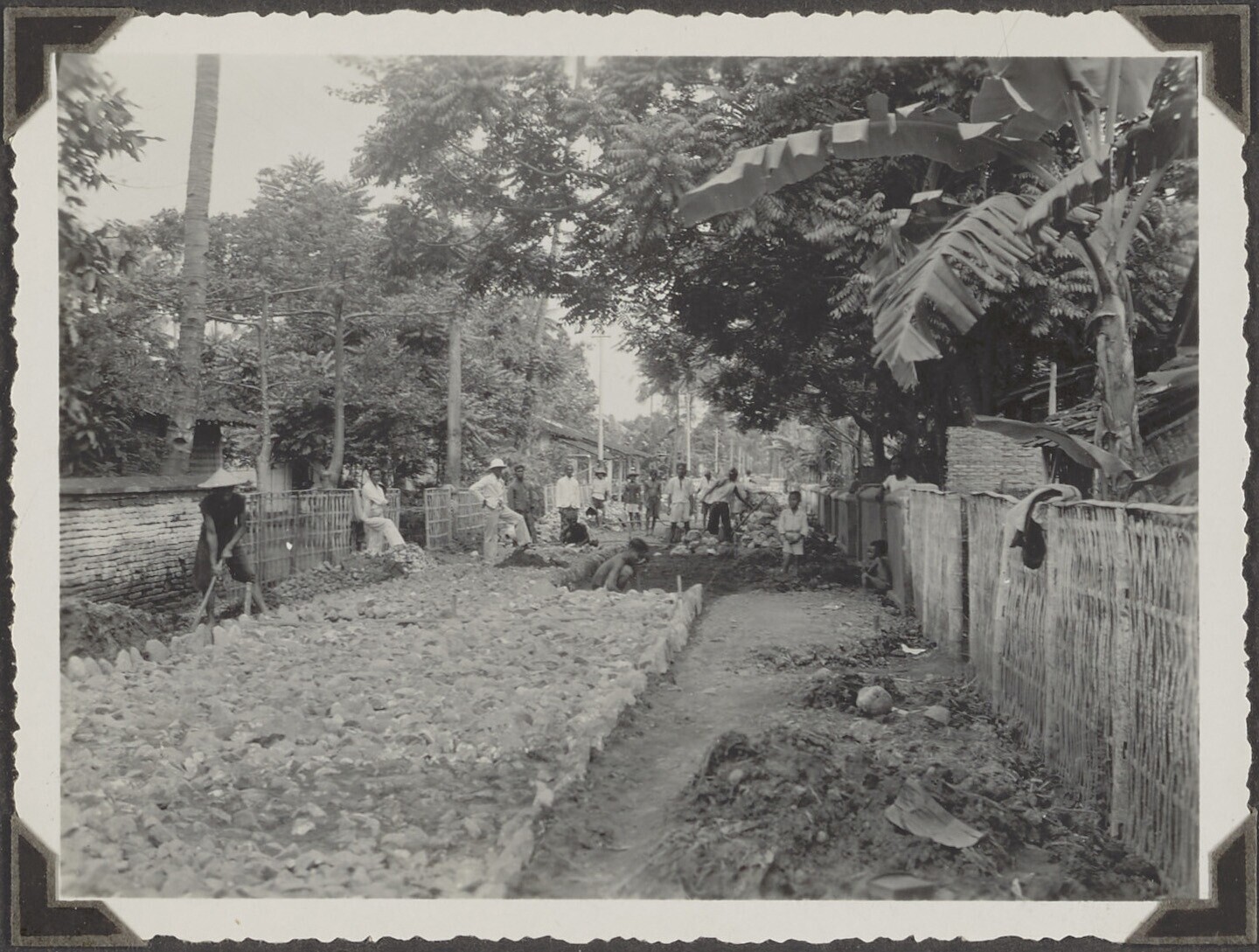 Arbeiders bestraten een weg nabij een zwembad in Kauman