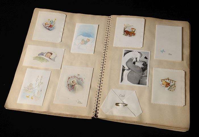 Plakboek met geboortekaartjes van baby's die vroedvr...