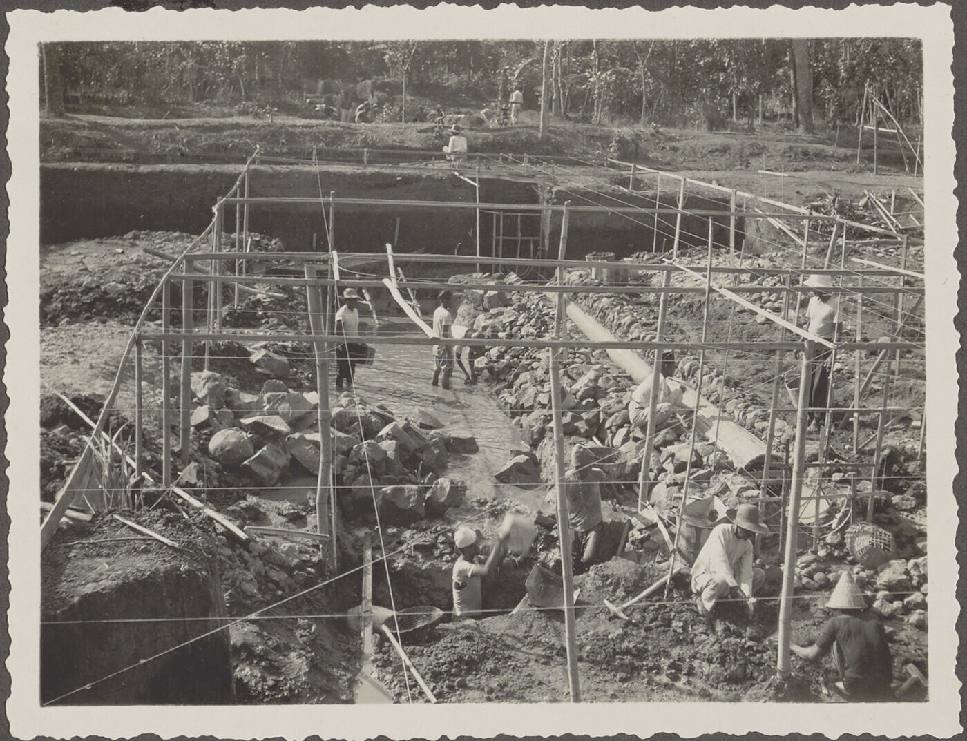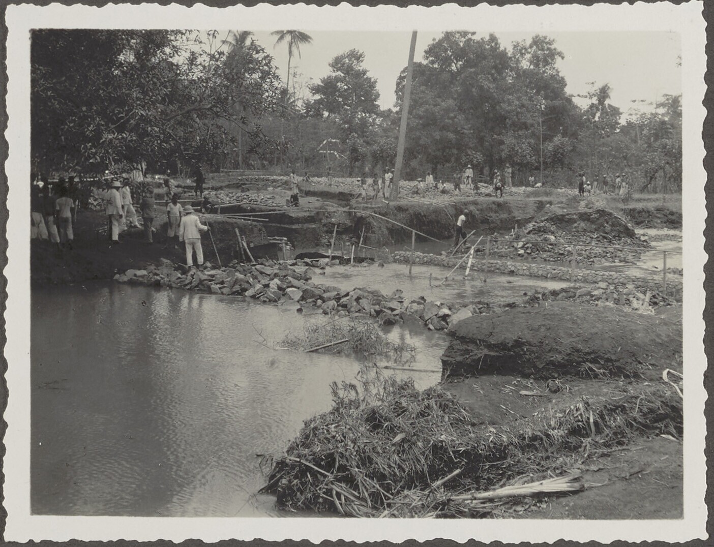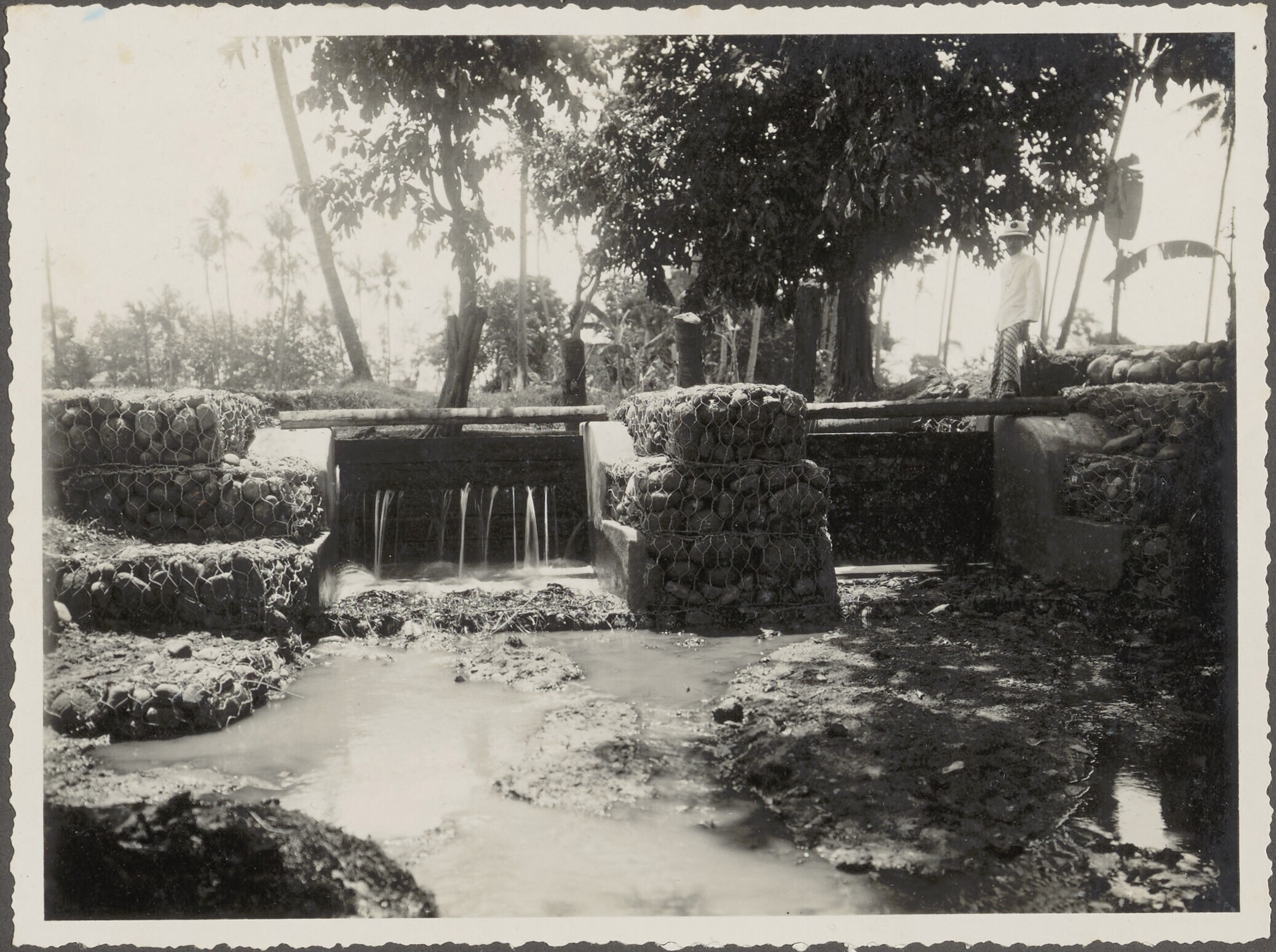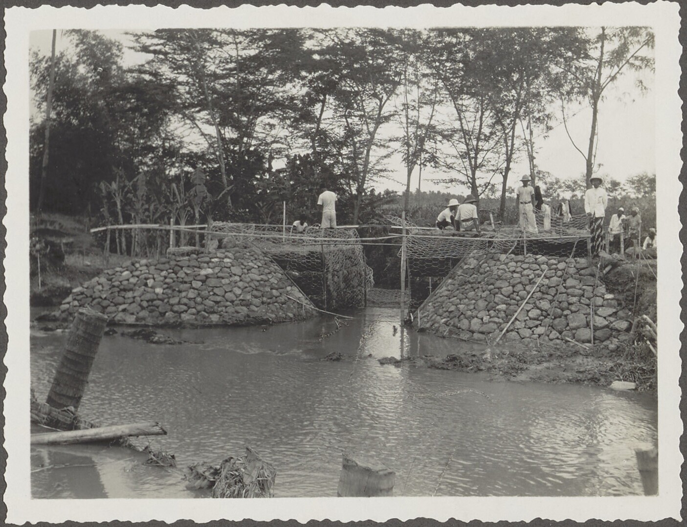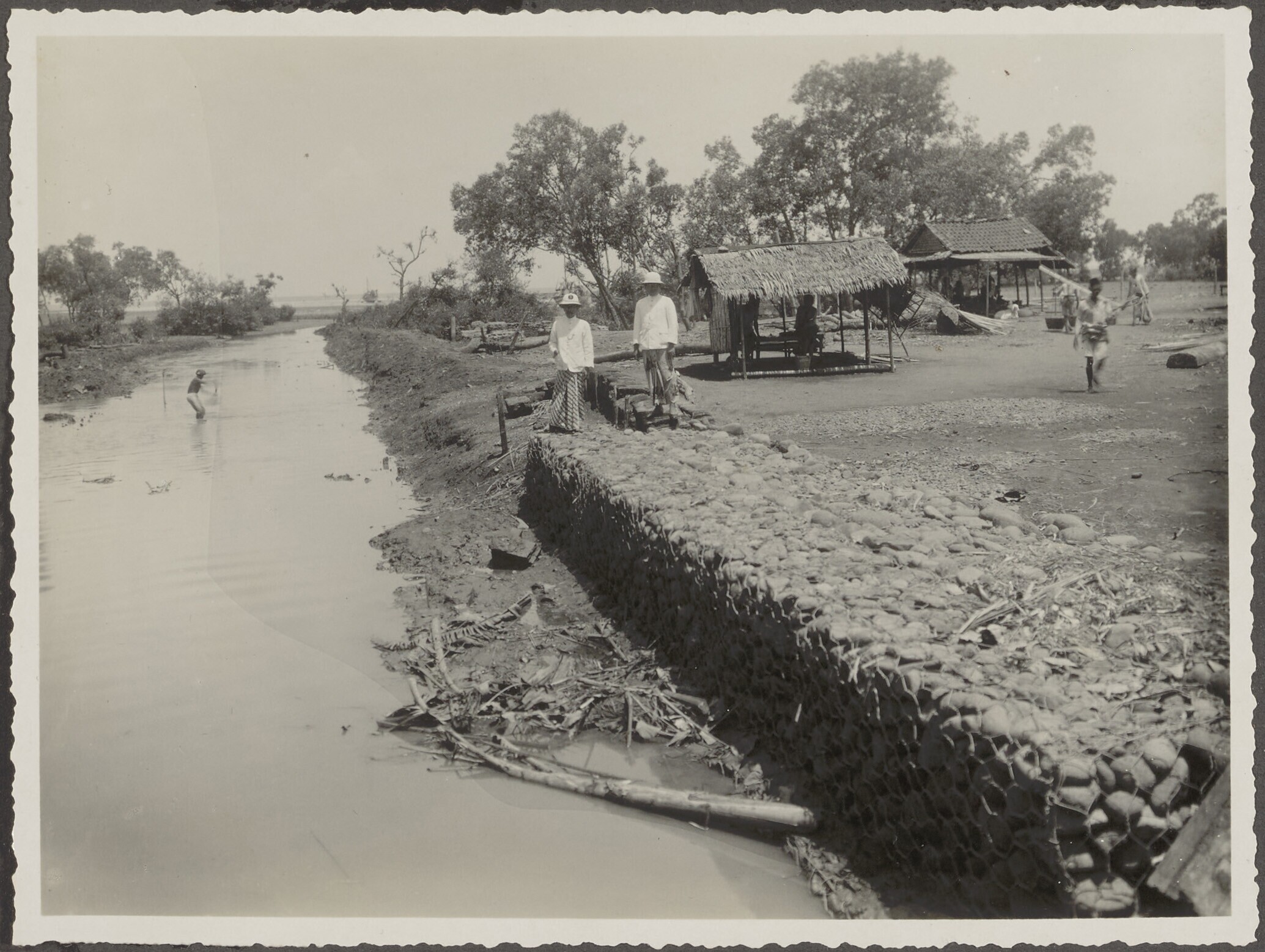 Twee Javaanse arbeiders werken aan een waterbouwkund...
