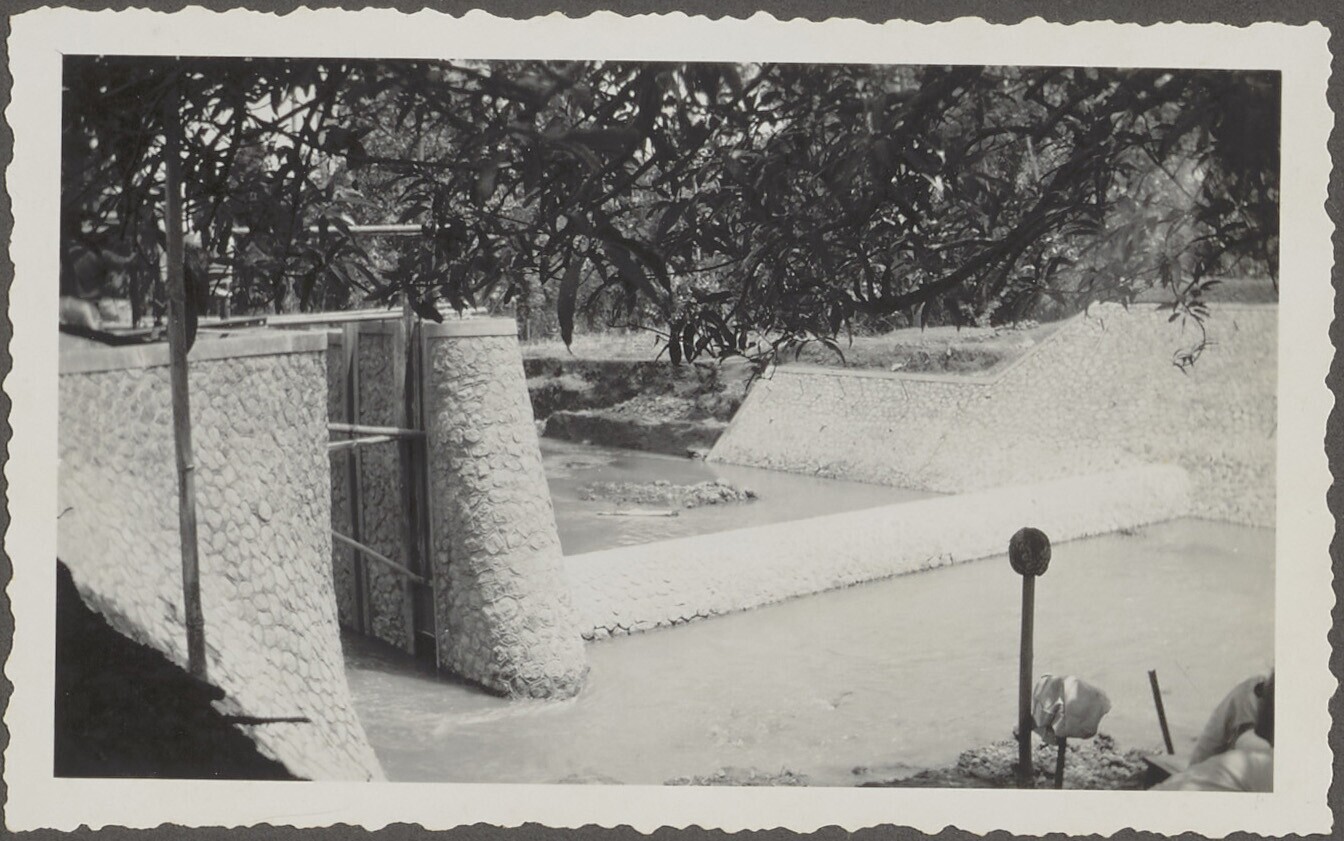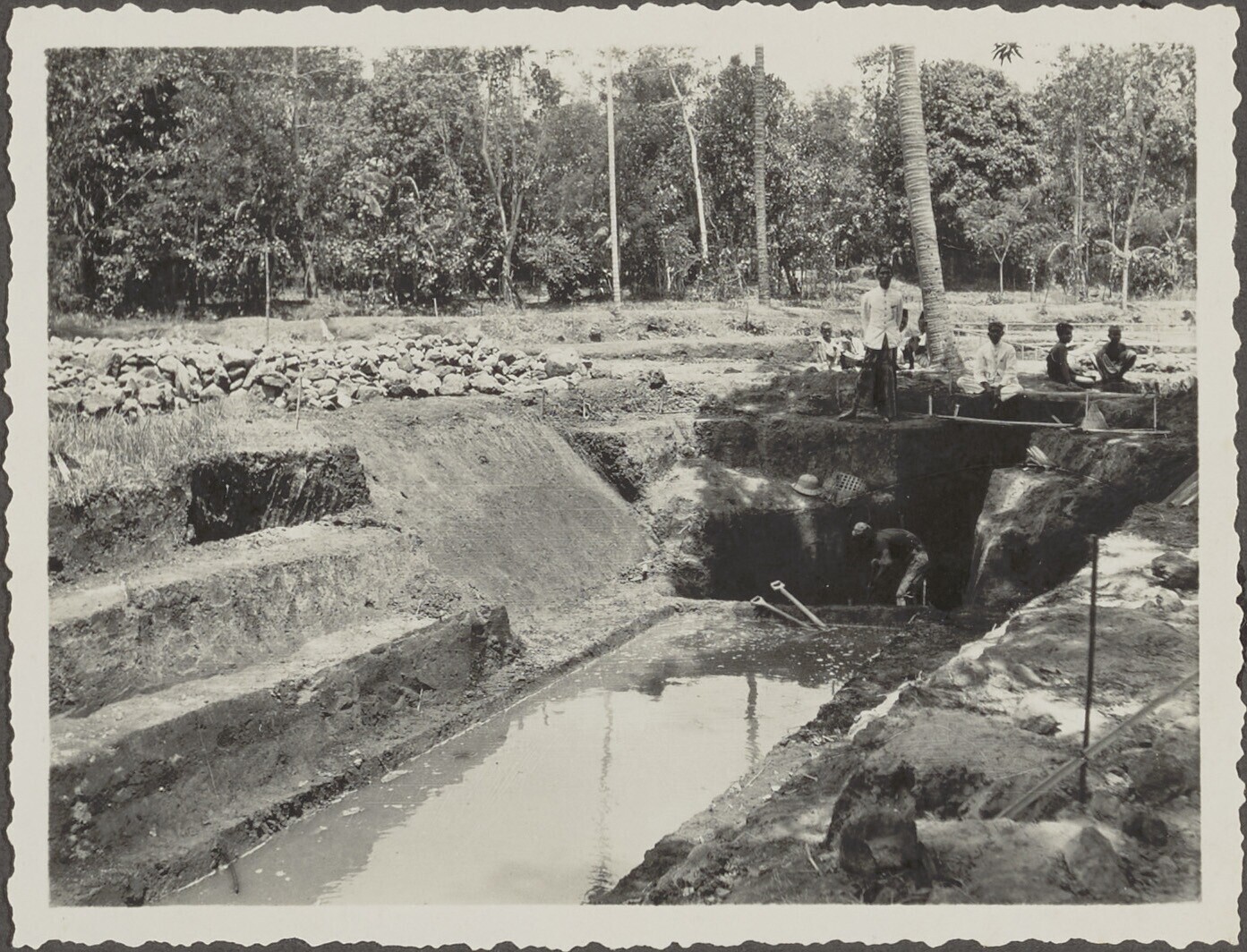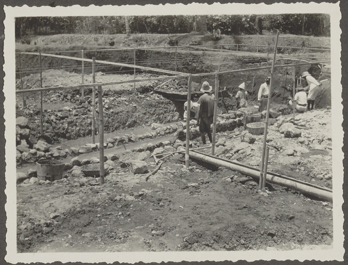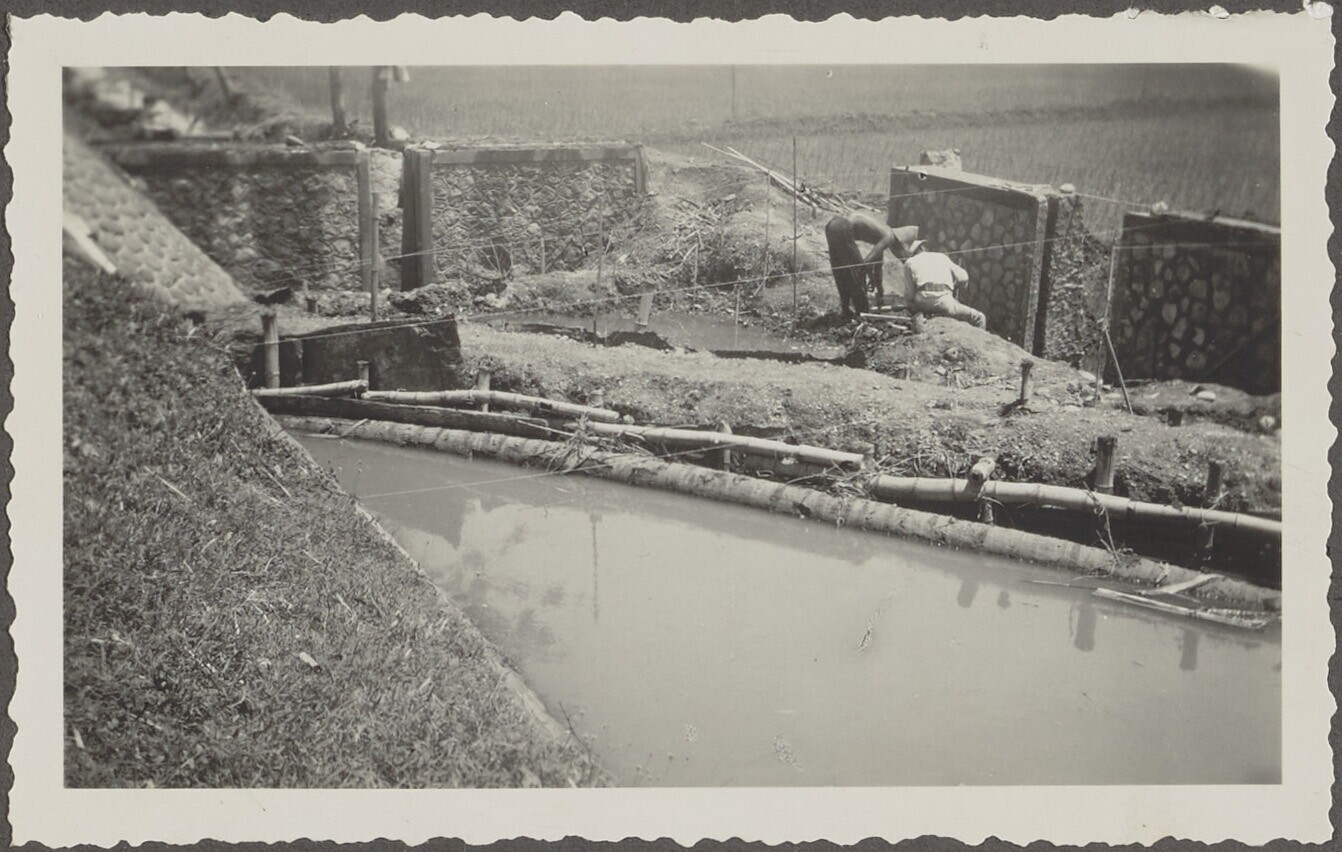 Twee Javaanse arbeiders werken aan een waterbouwkund...