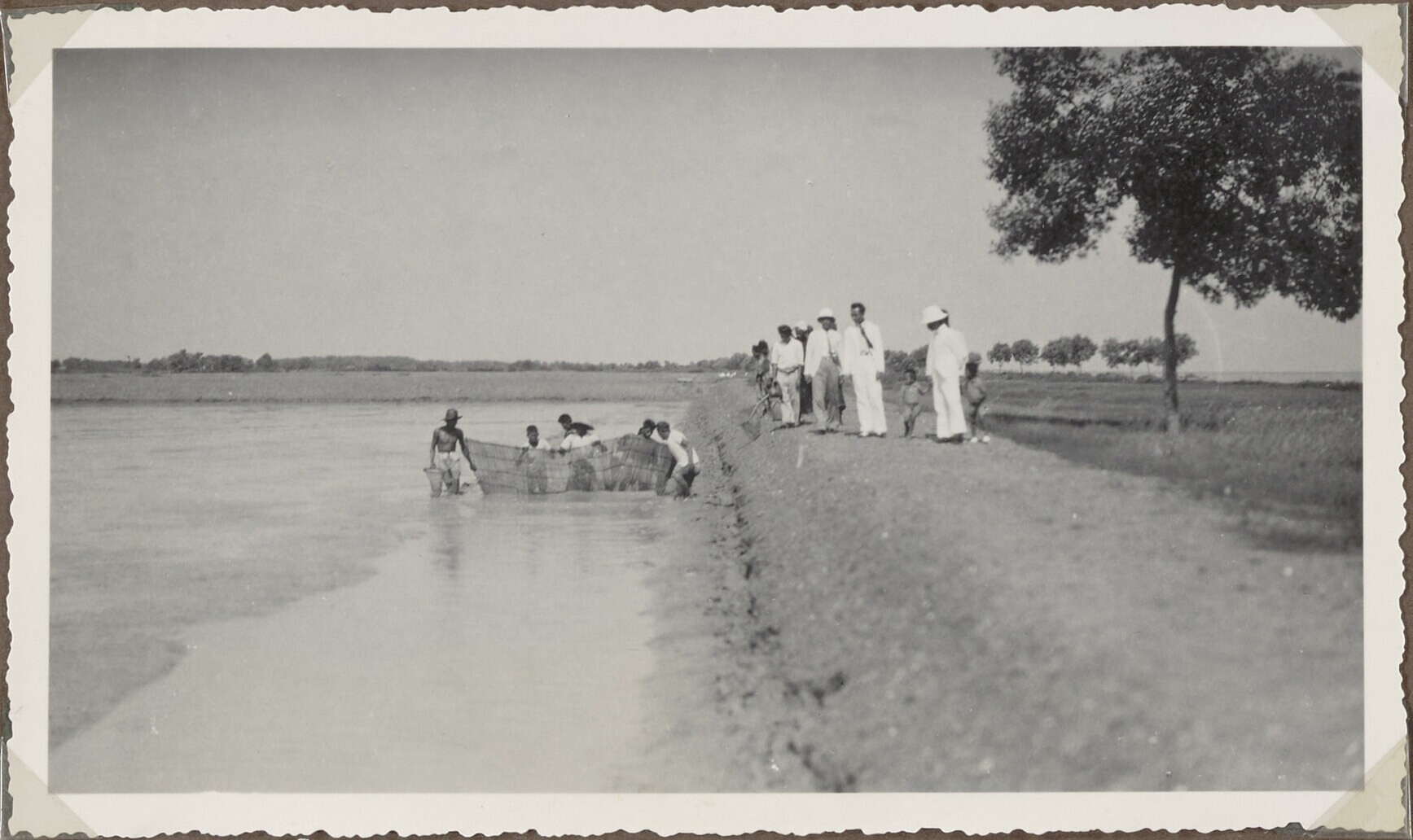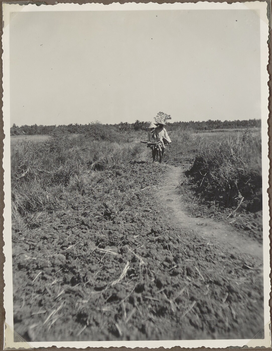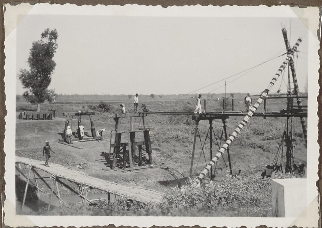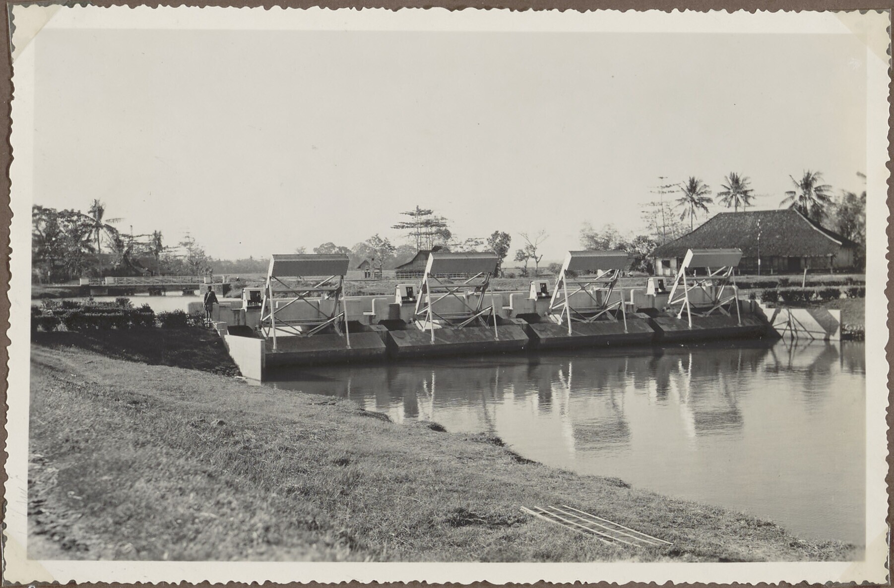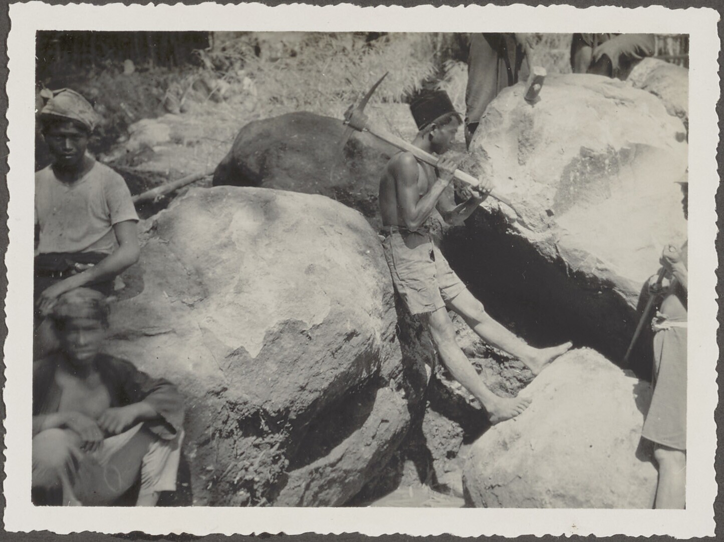 Twee Javaanse arbeiders werken aan een waterbouwkund...