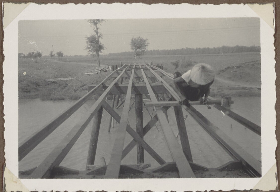 Gezicht op een (tijdelijke) houten brug, waar druk g...