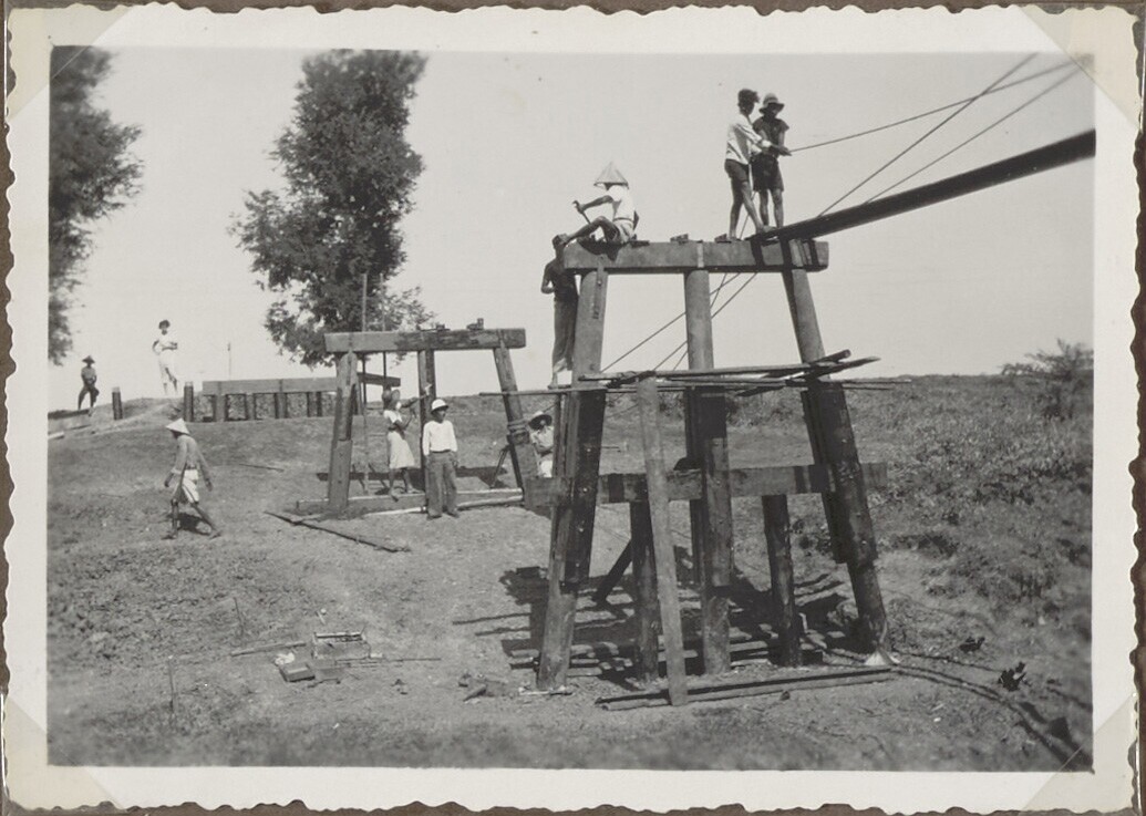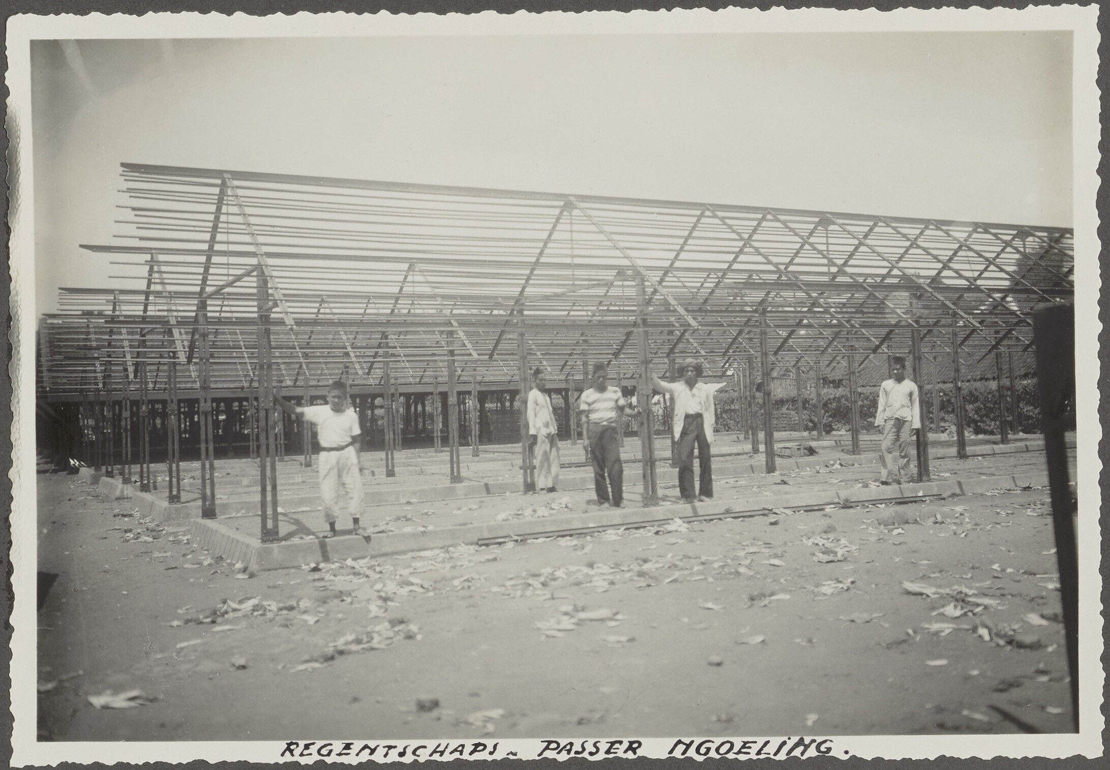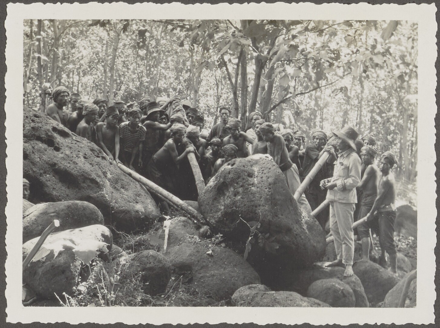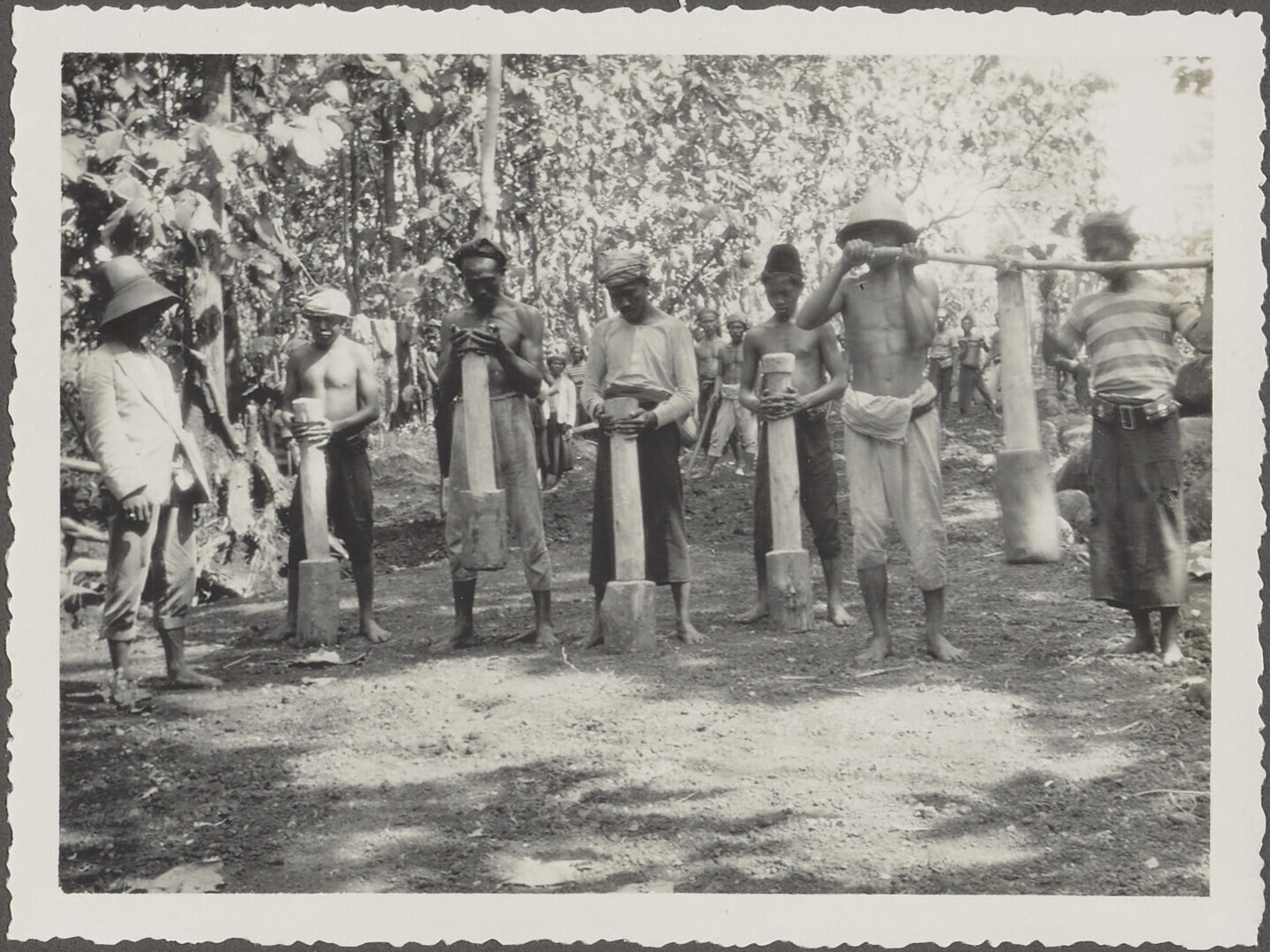 De Javaanse arbeiders heien met mankracht de pijlers...
