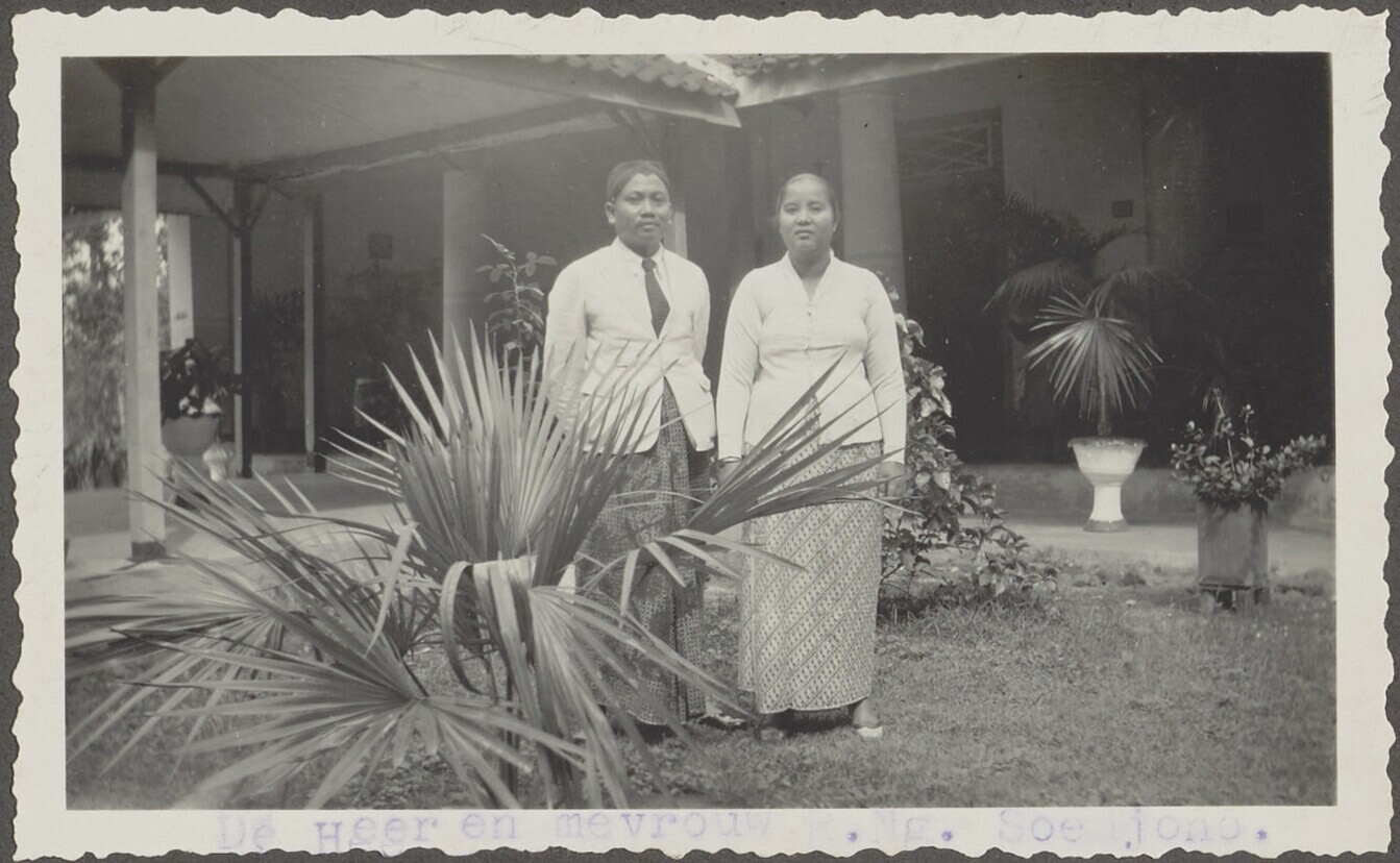 De heer en mevrouw Ng. Soedjono staan in de tuin voo...
