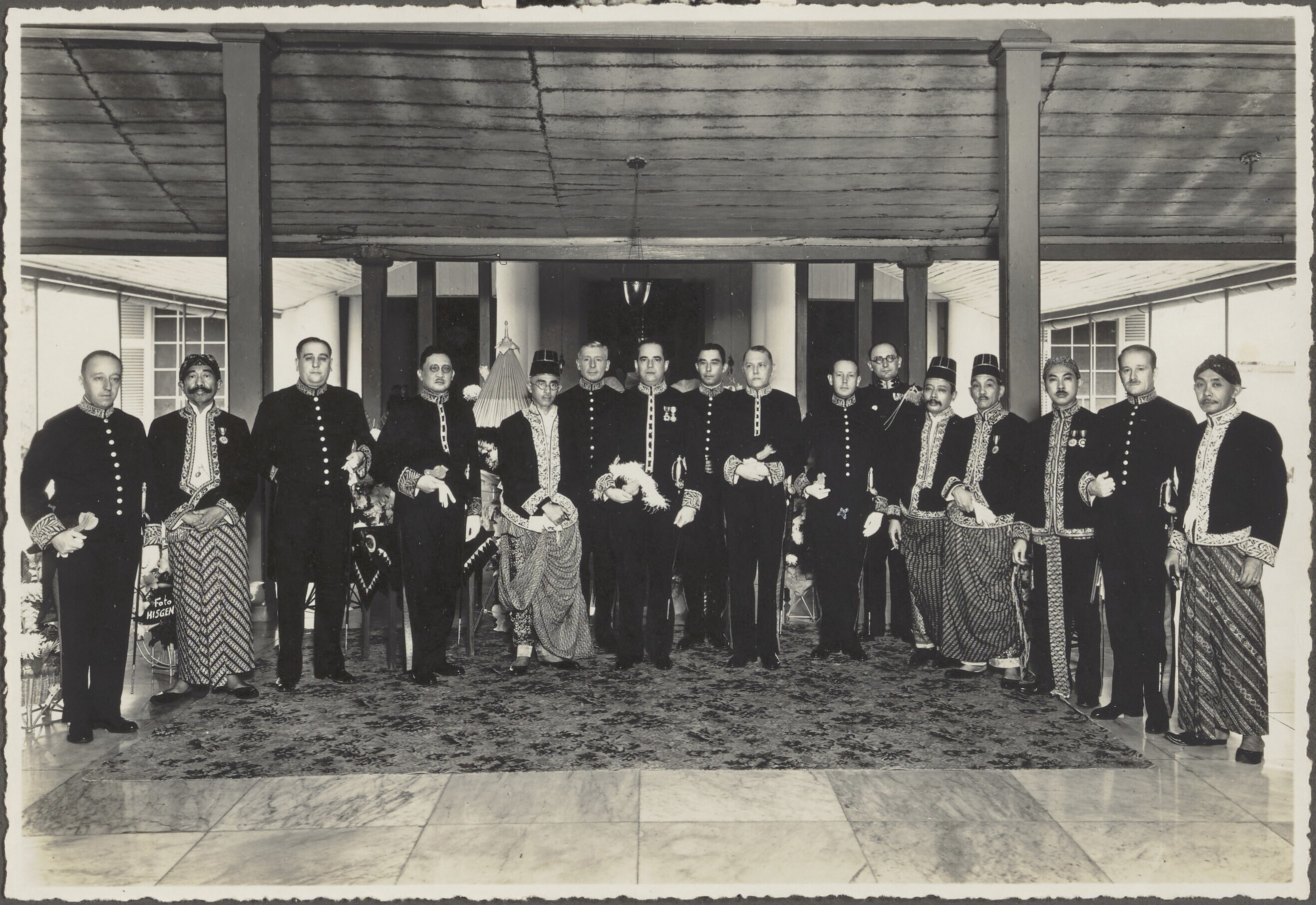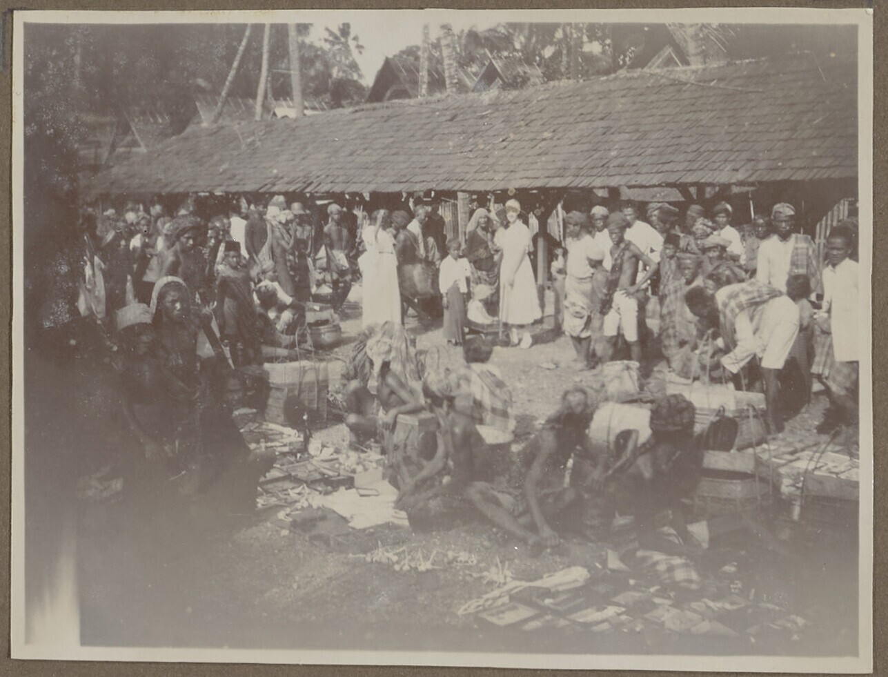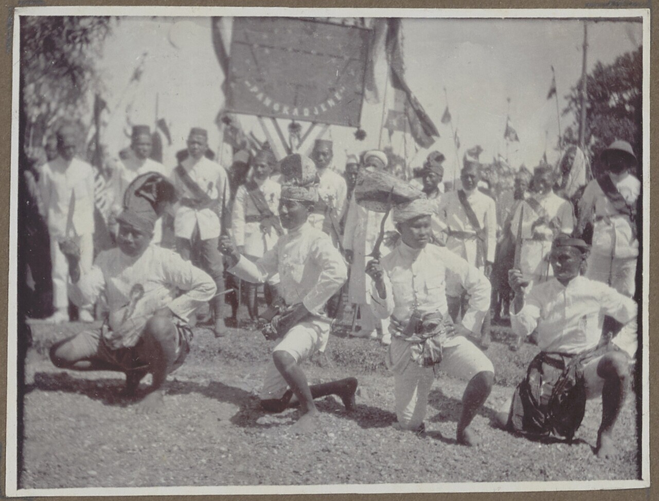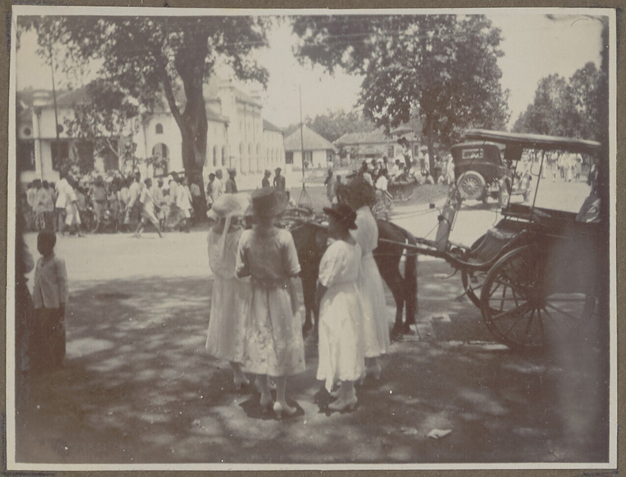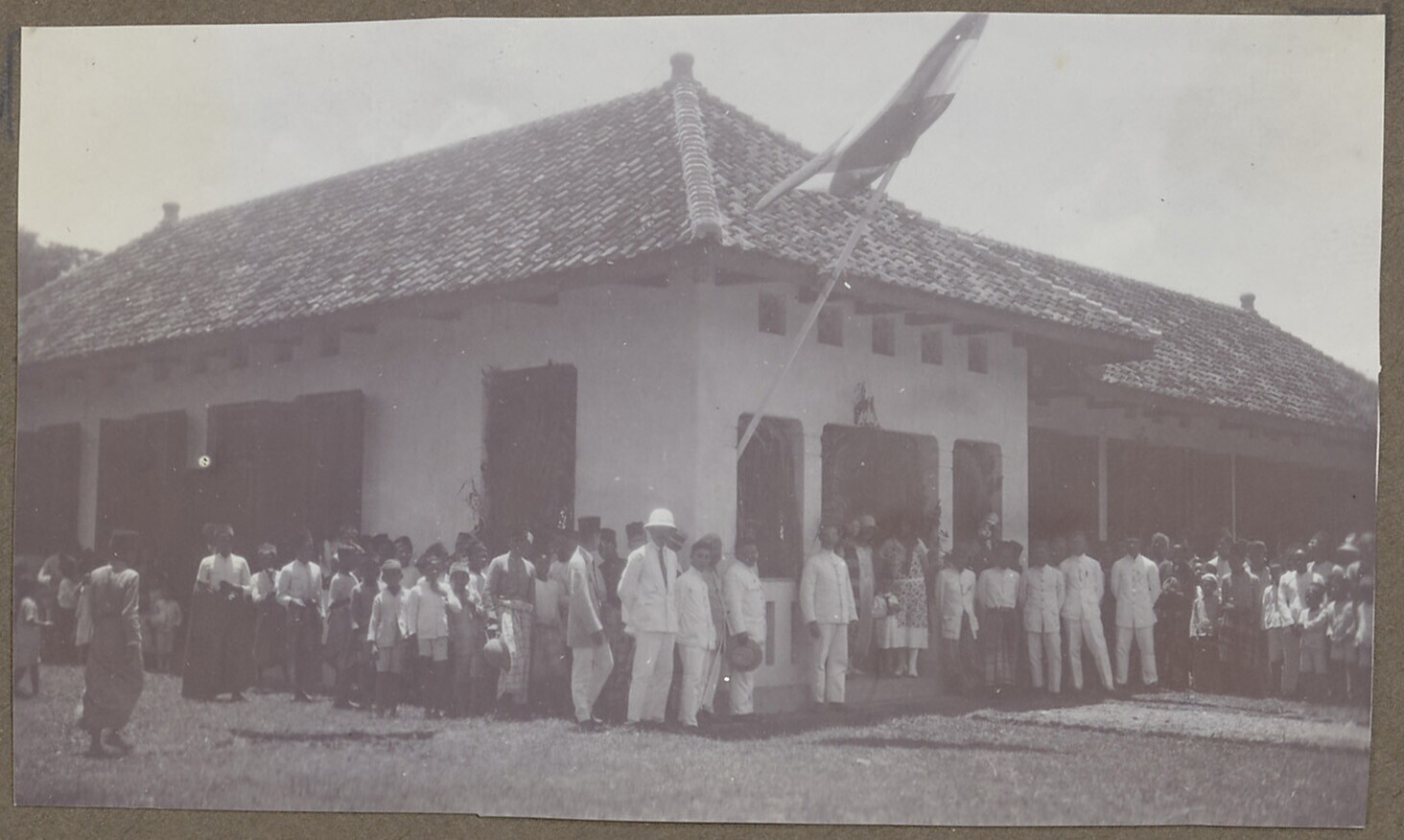Enkele Javaanse mannen en vrouwen staan op het plein...