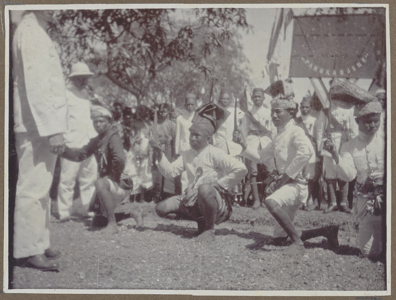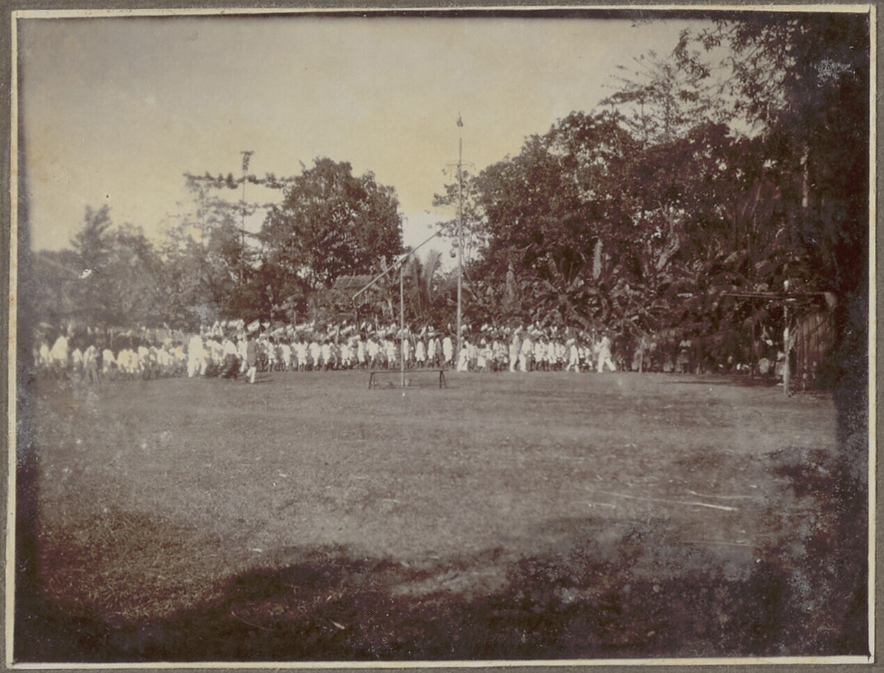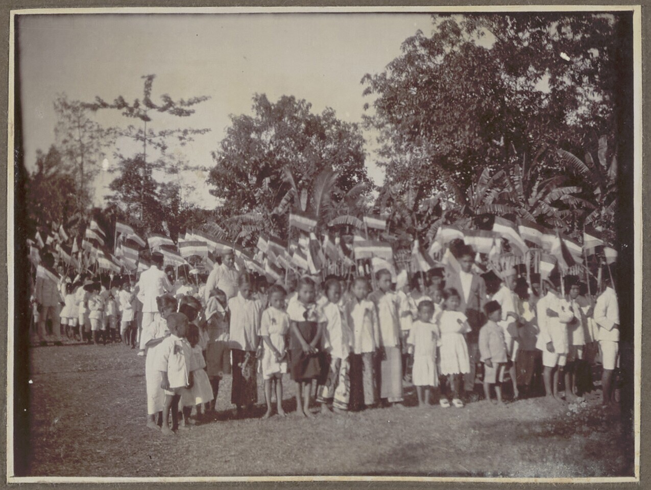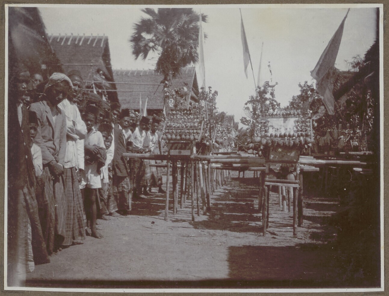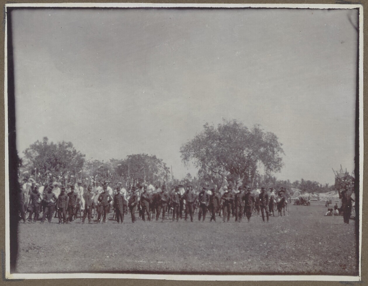 Enkele Javaanse mannen en vrouwen staan op het plein...