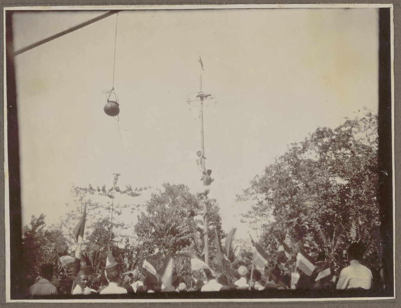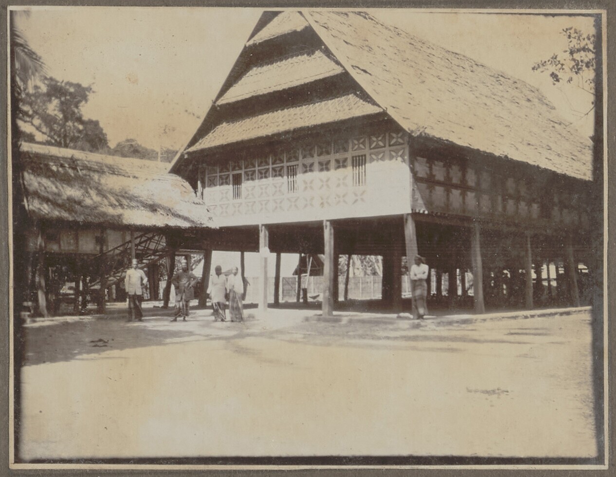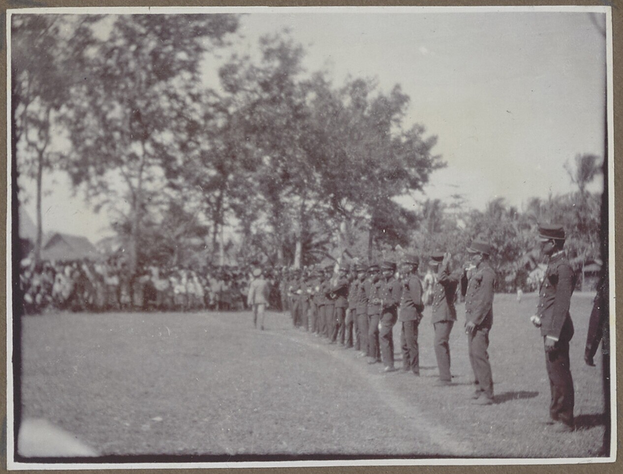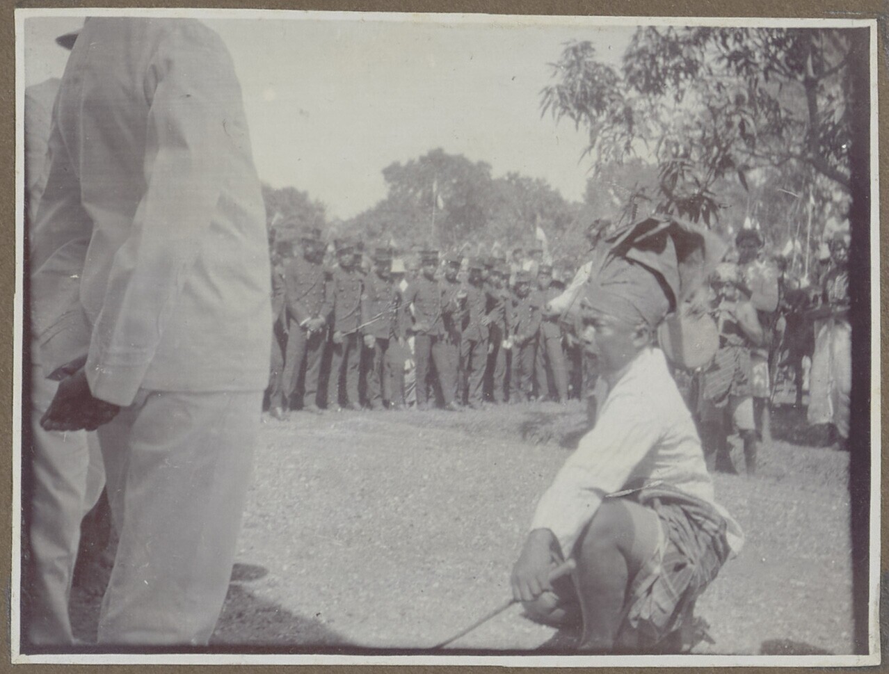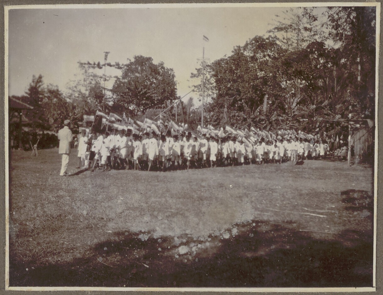 Enkele Javaanse mannen en vrouwen staan op het plein...