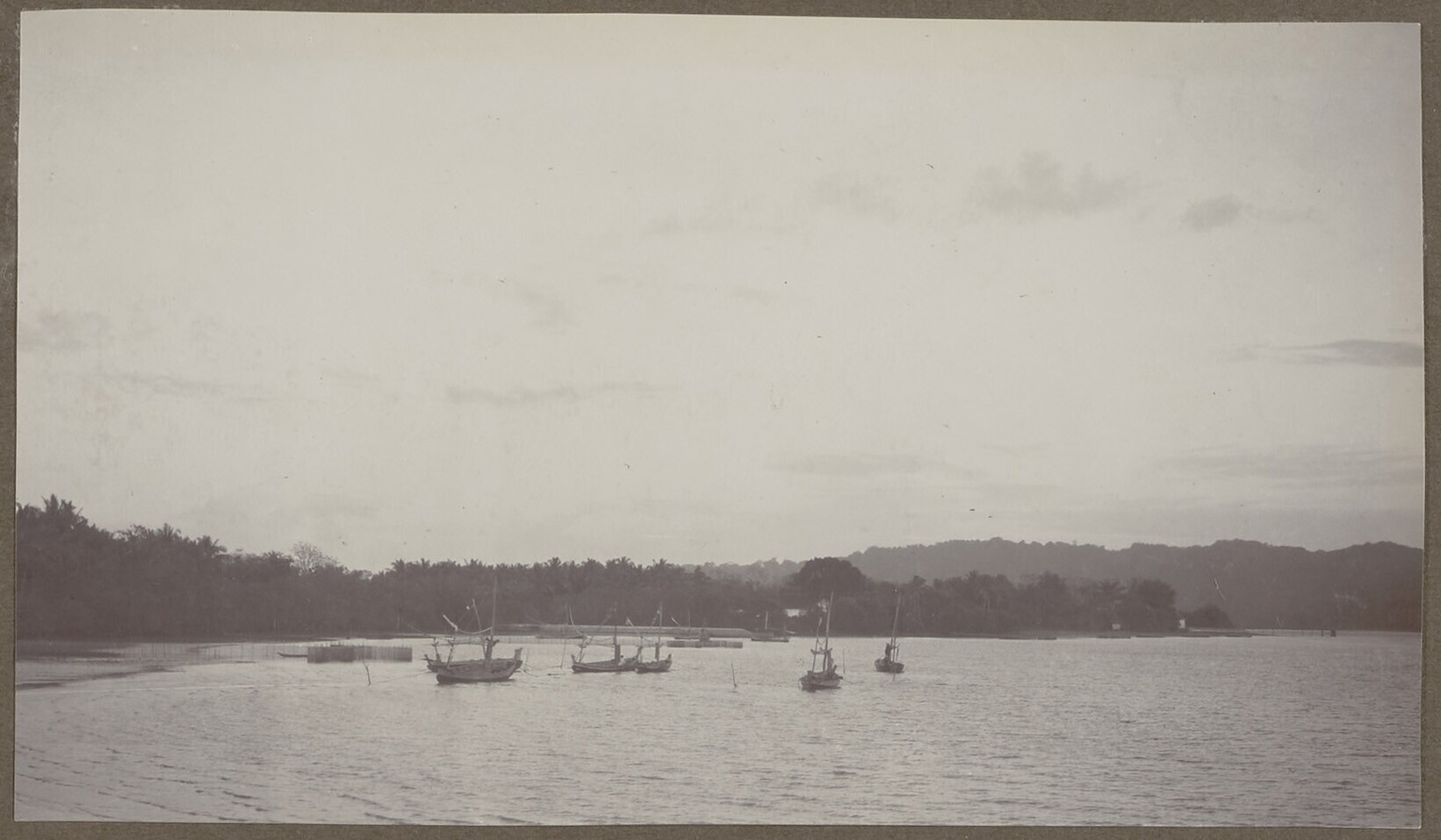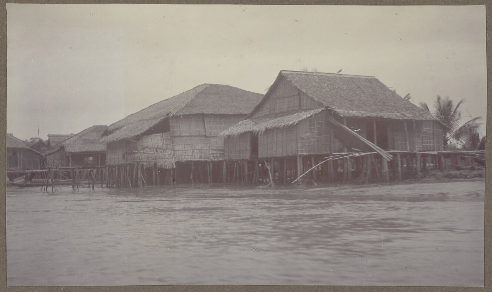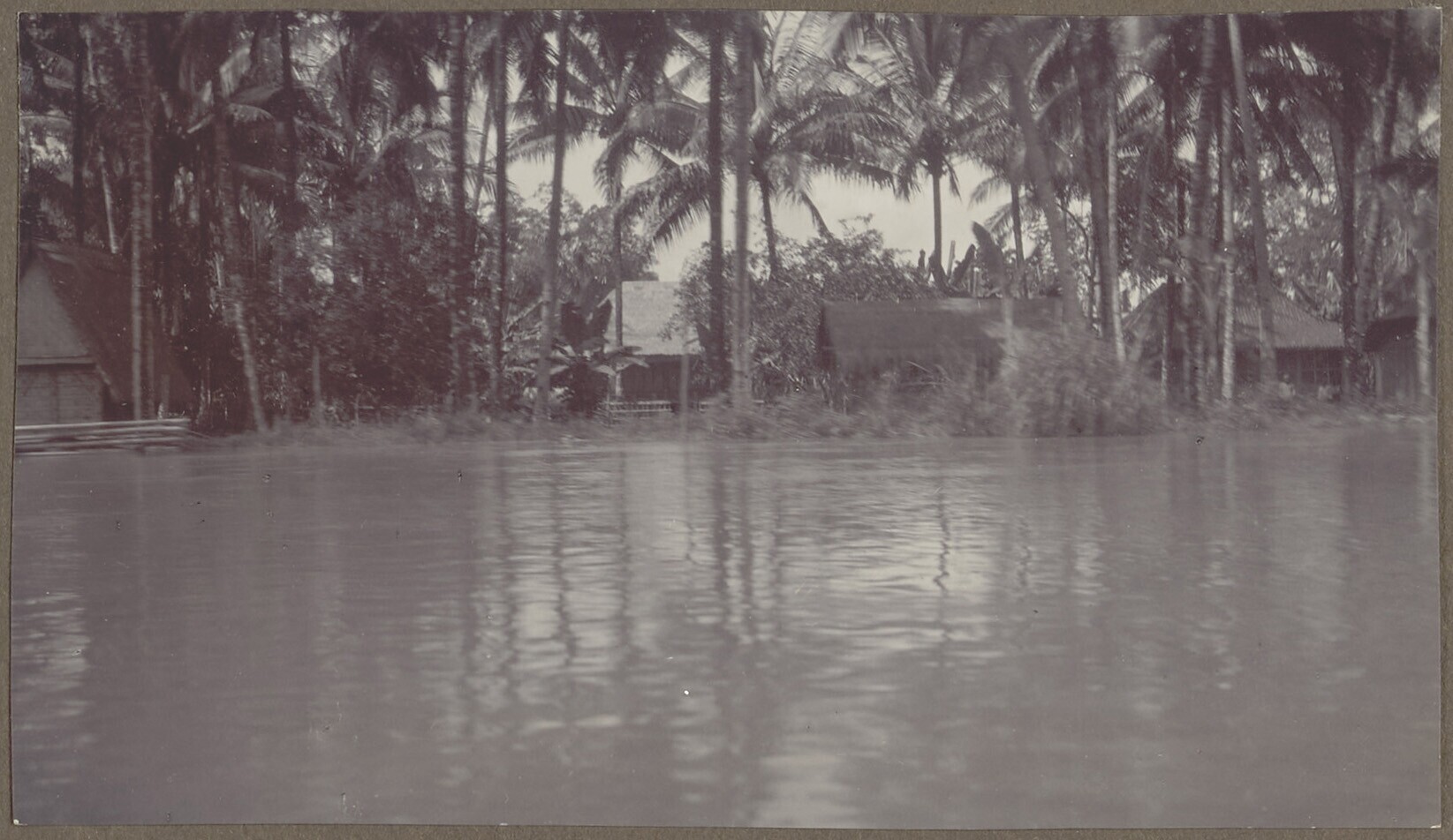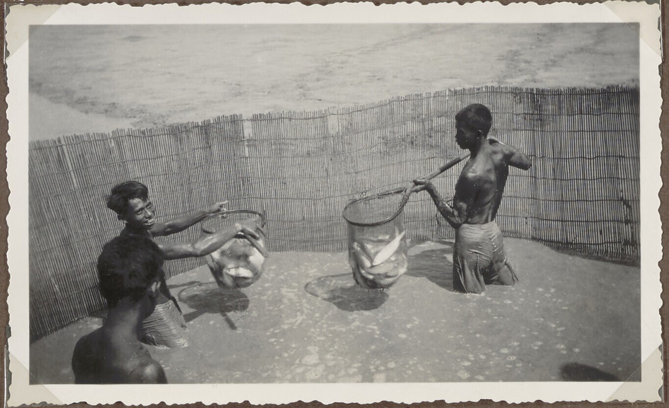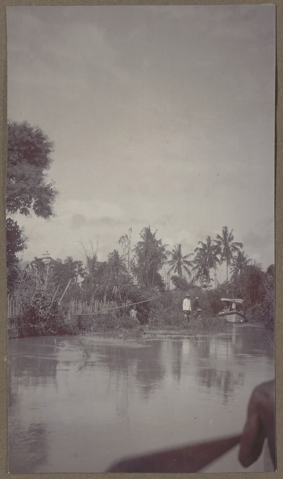 Uitzicht op een waterkering, waar drie Javaanse mann...