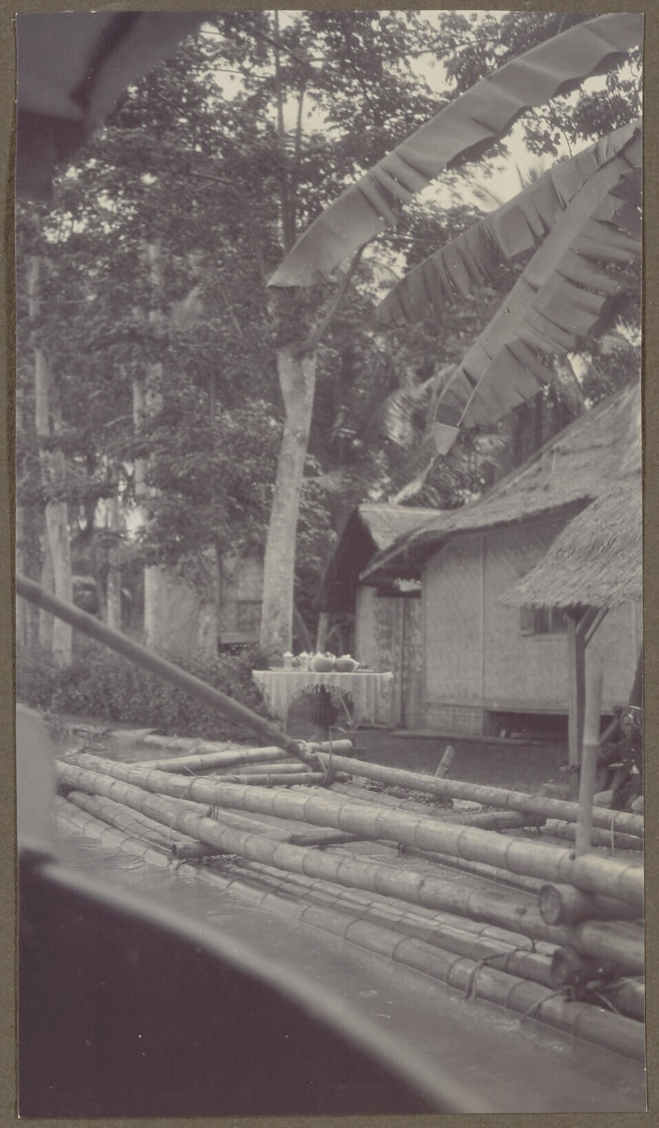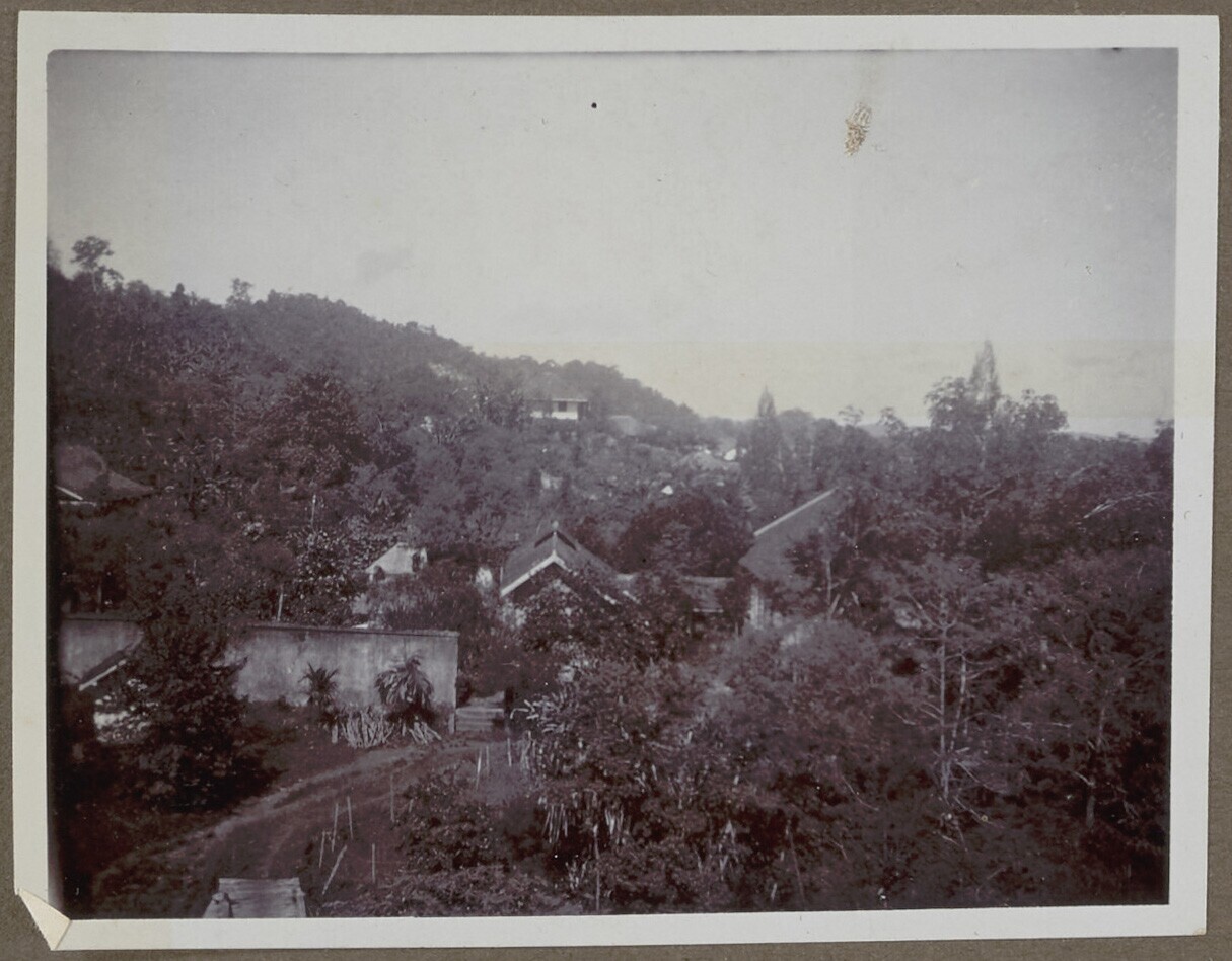 Gezicht op een dorpshuis met enkele Europese vrouwen...