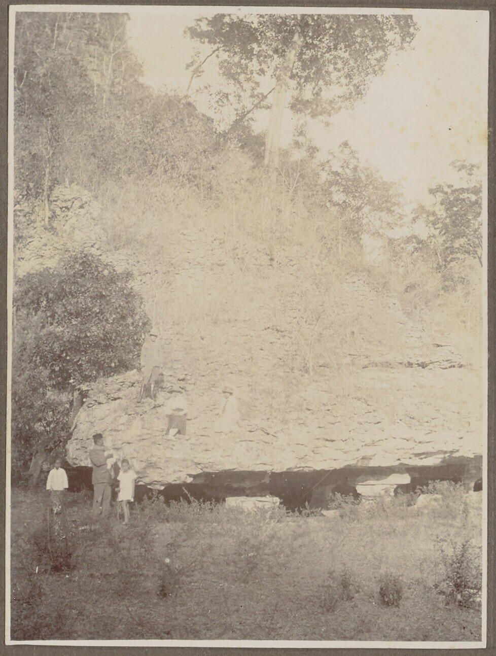 Javaanse mannen en kinderen staan bij en rotsformati...