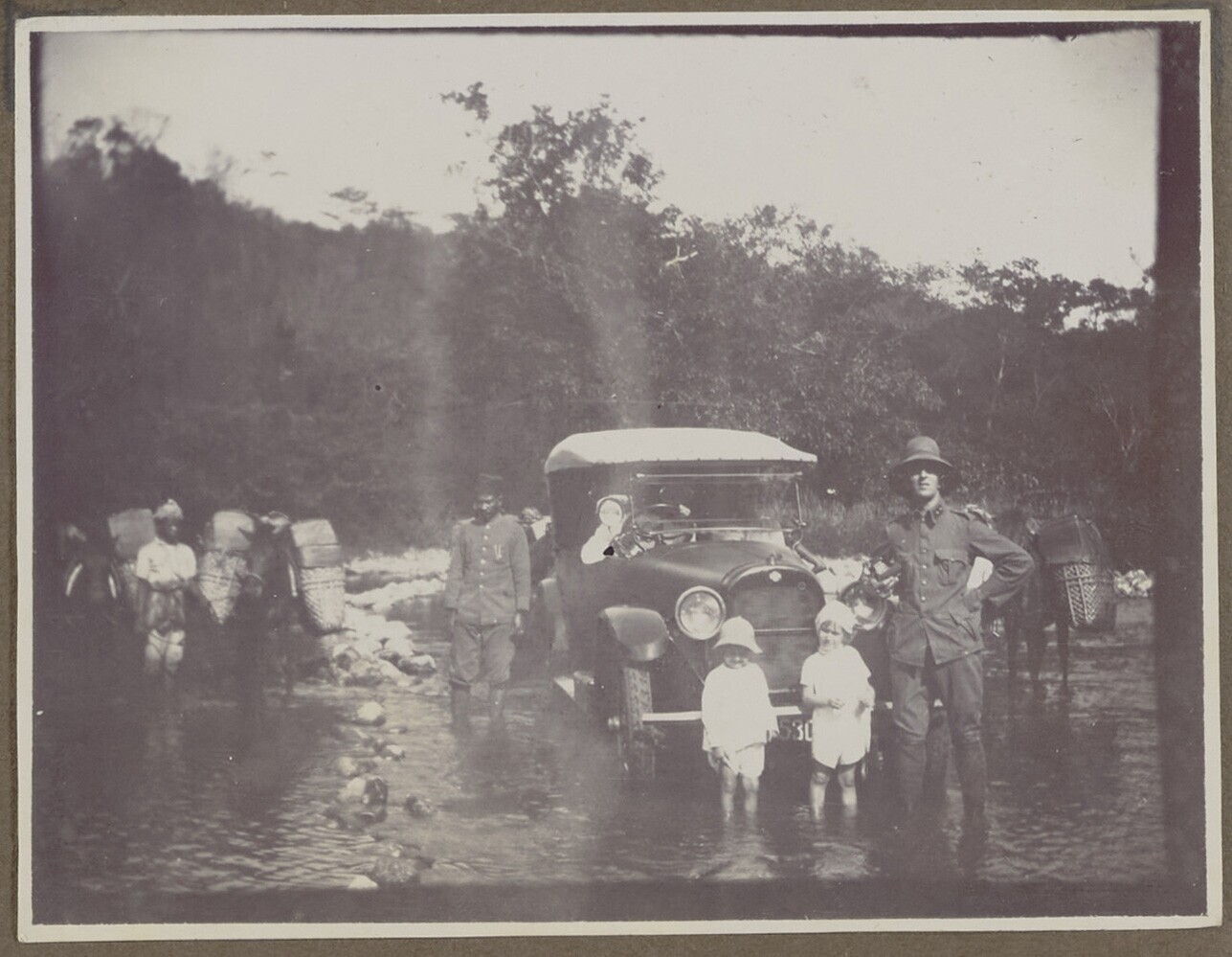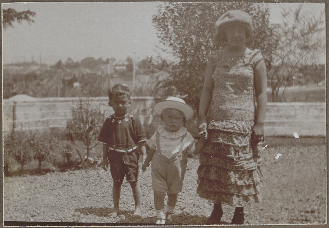 Portret van twee vrouwen en kinderen in een rijtuig ...