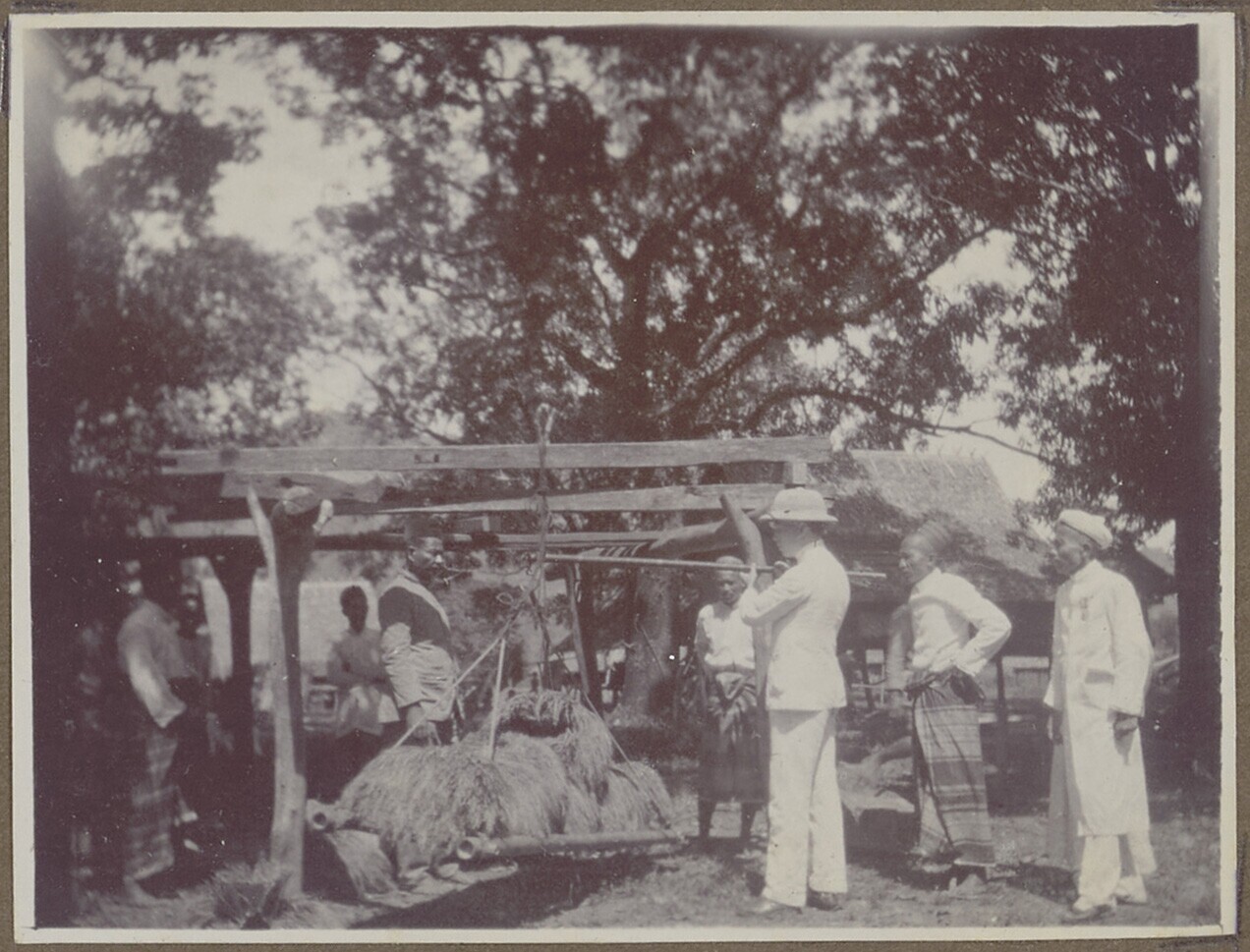 Een Europeaan weegt de rijst, onder toeziend oog van...