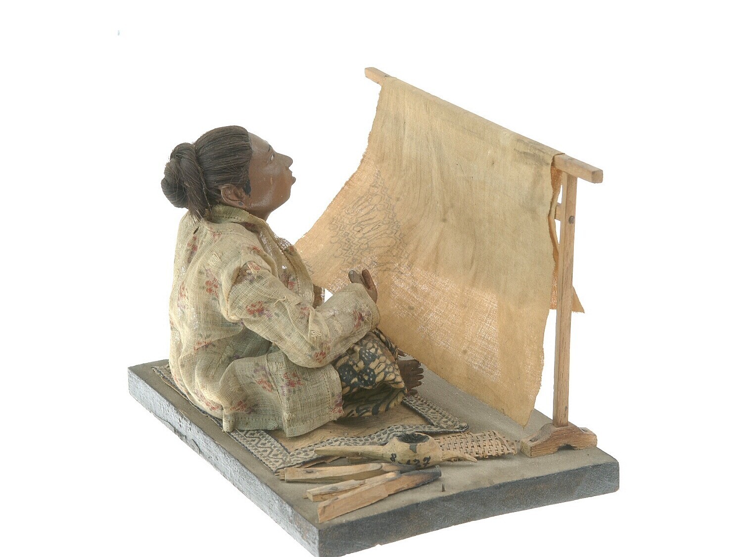 Model van een batikkende vrouw met attributen