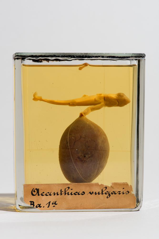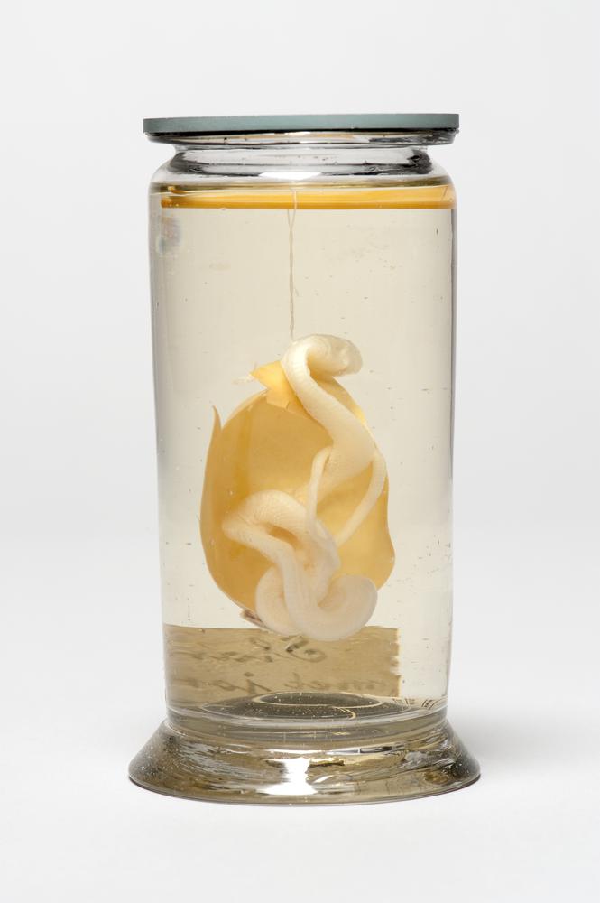 Vloeistofpreparaat van een half slangenei met jonge ...