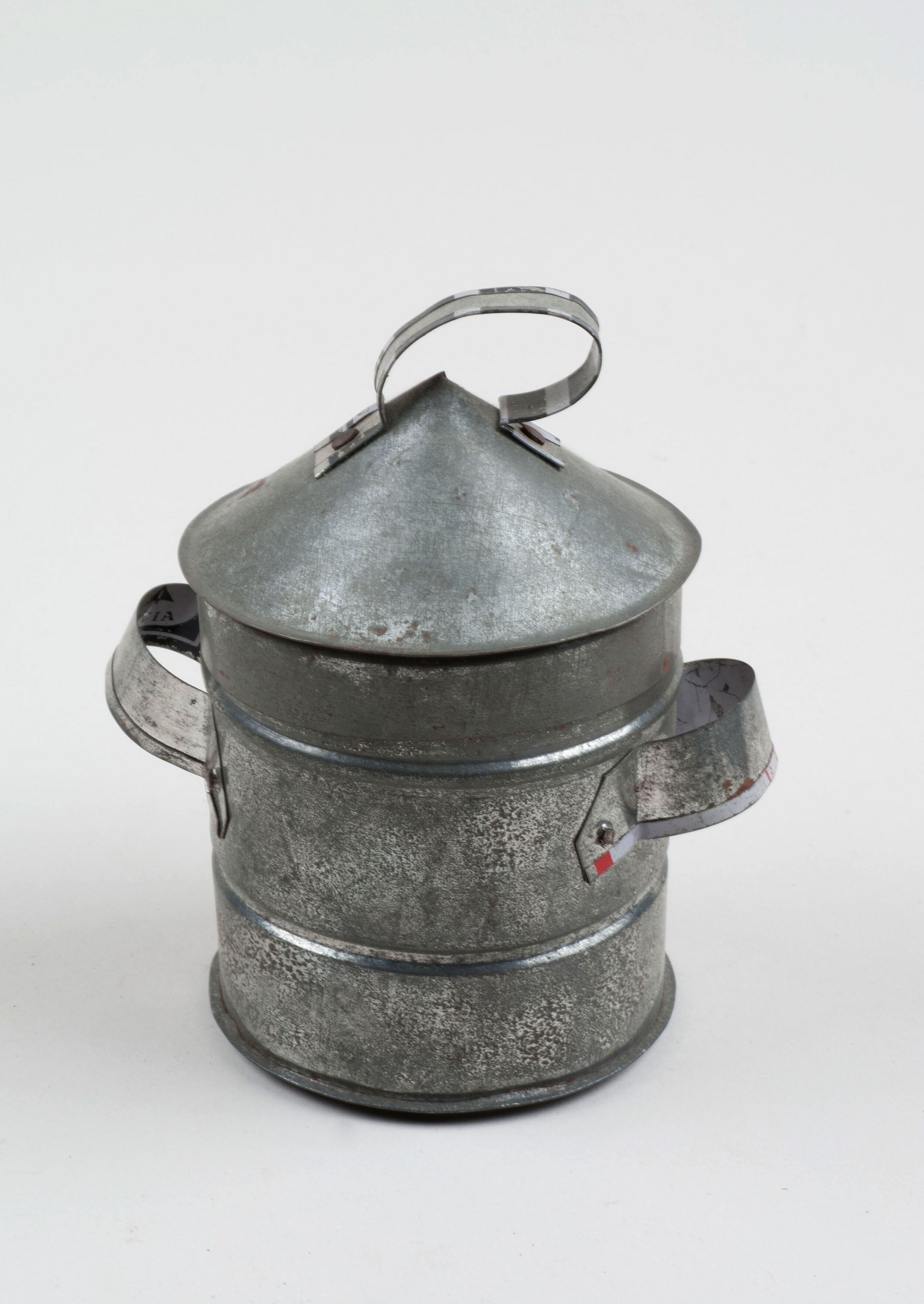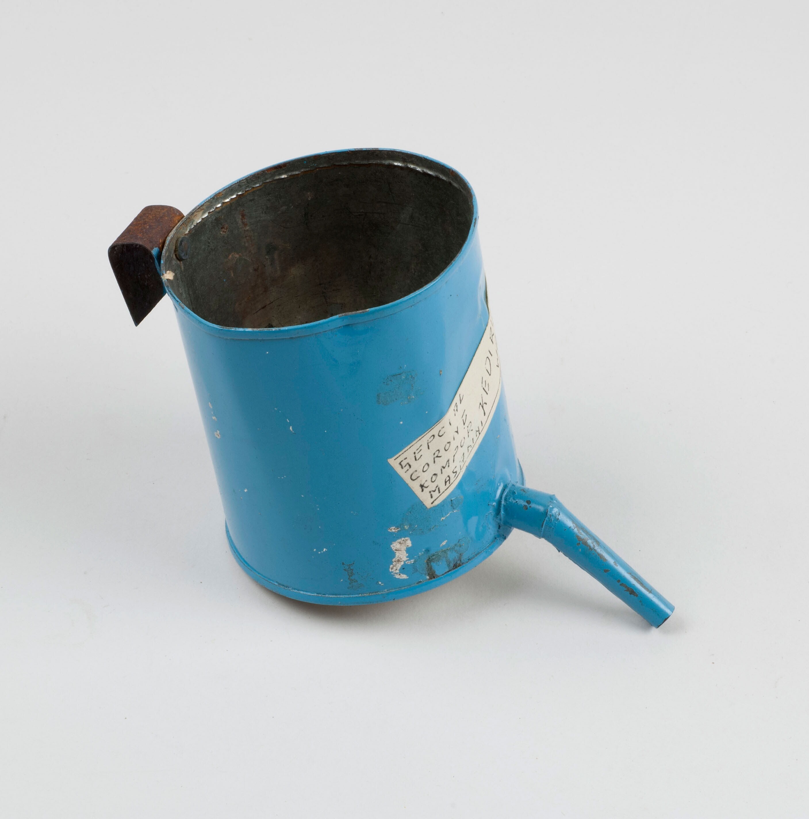 Olielamp van glas en blik, gebruikt als kinderspeelgoed