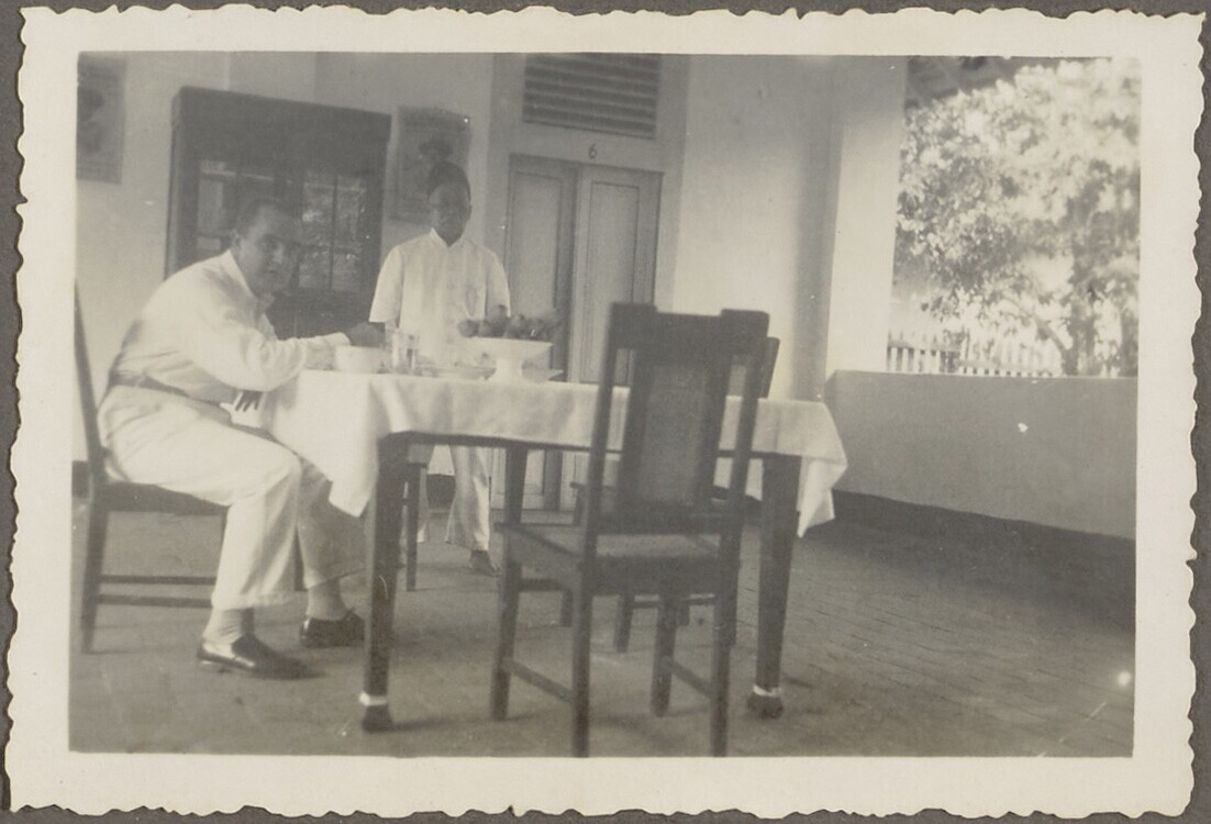 Portret van de heer Broers tijdens de maaltijd met e...