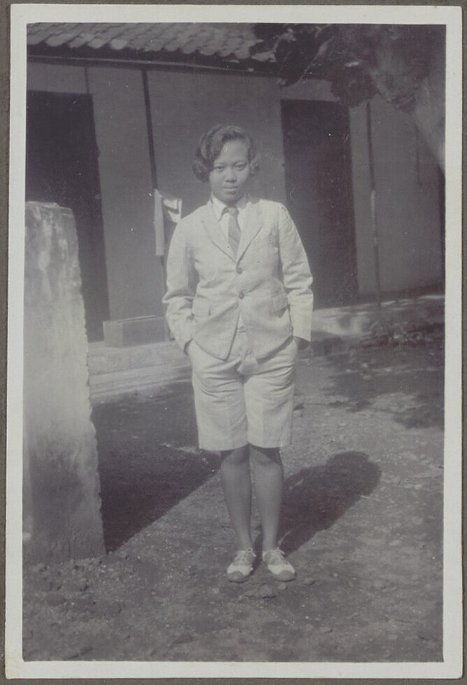 Portret van jonge vrouw in mannenpak
