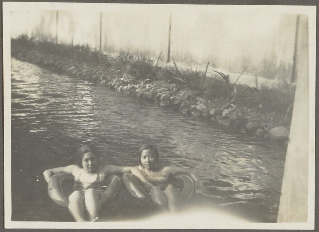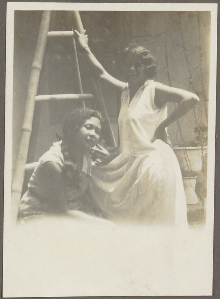 Portret van twee vrouwen voor een bamboetrap