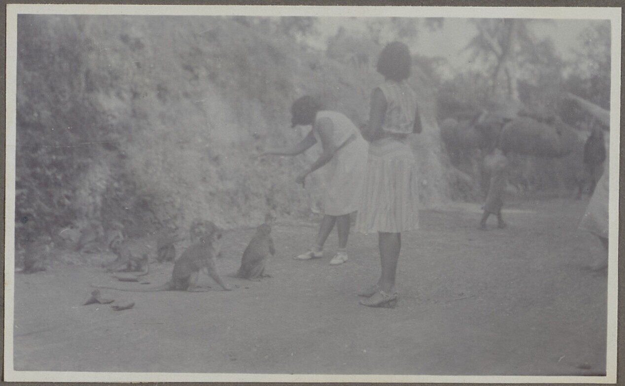Vrouwen geven apen eten man op de achtergrond draagt...