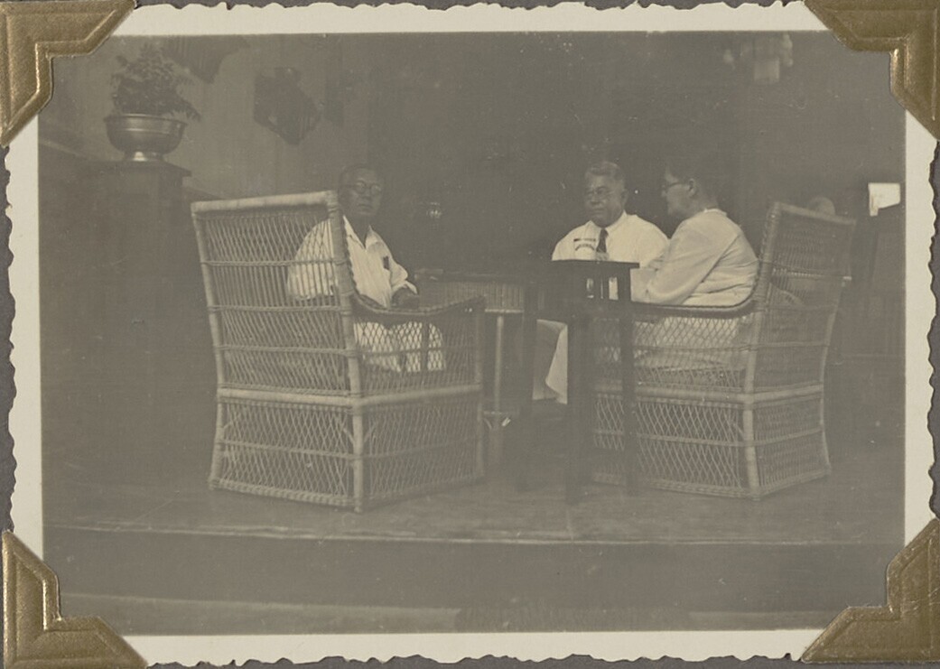 Portret van twee vrouwen en één man aan tafel in de ...