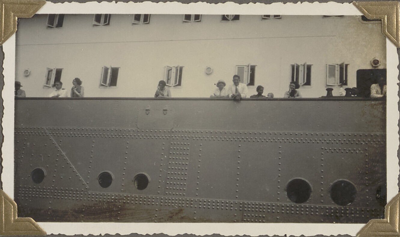 Passagiers nemen afscheid aan boord van D.M.S. Baloeran
