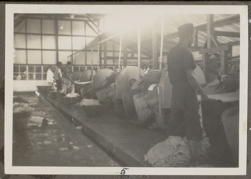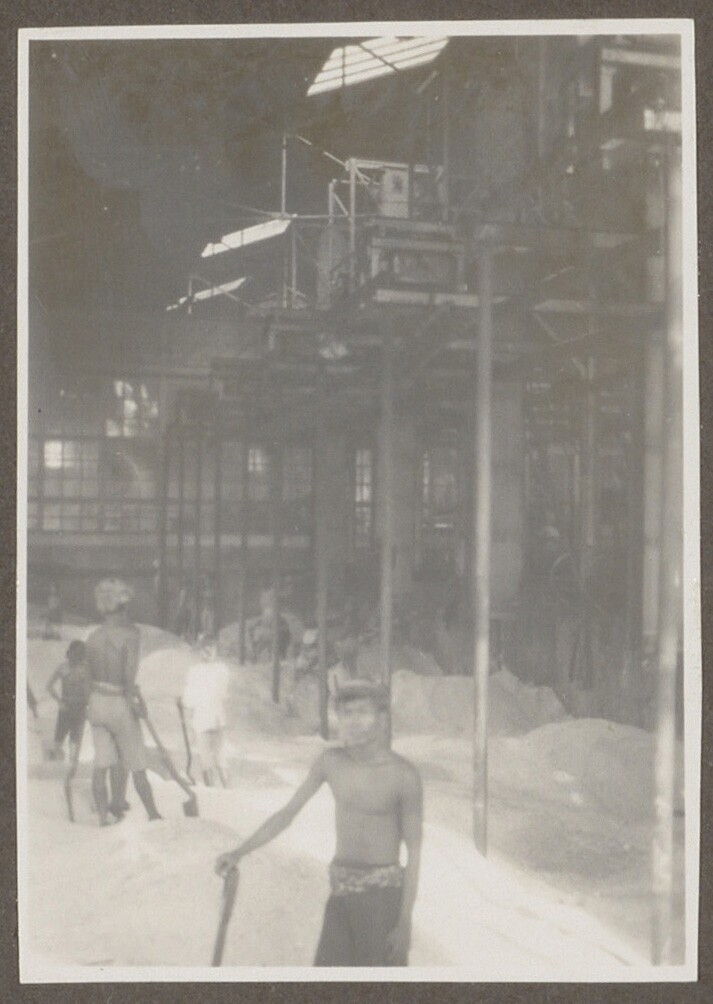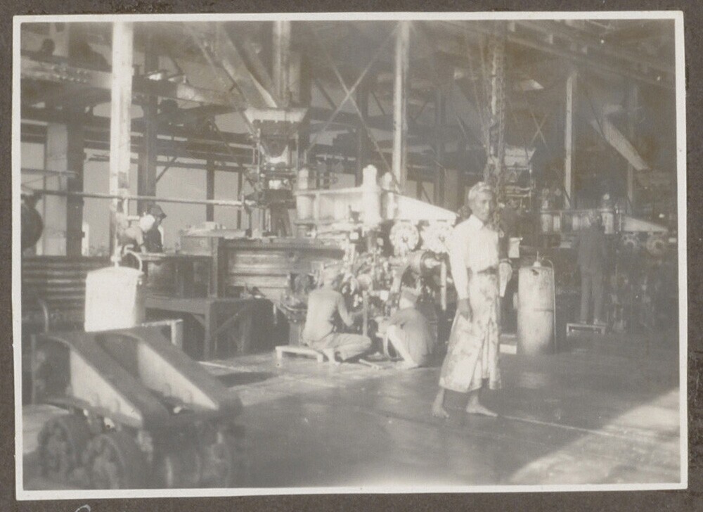 Cohen met Indische medewerkers naast machines in fab...