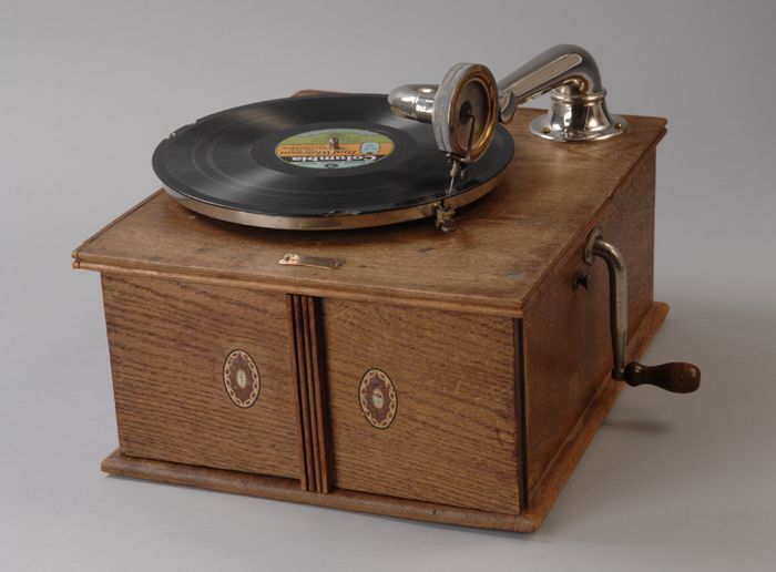 Koffergrammofoon, in bewaring gegeven bij muziekhand...