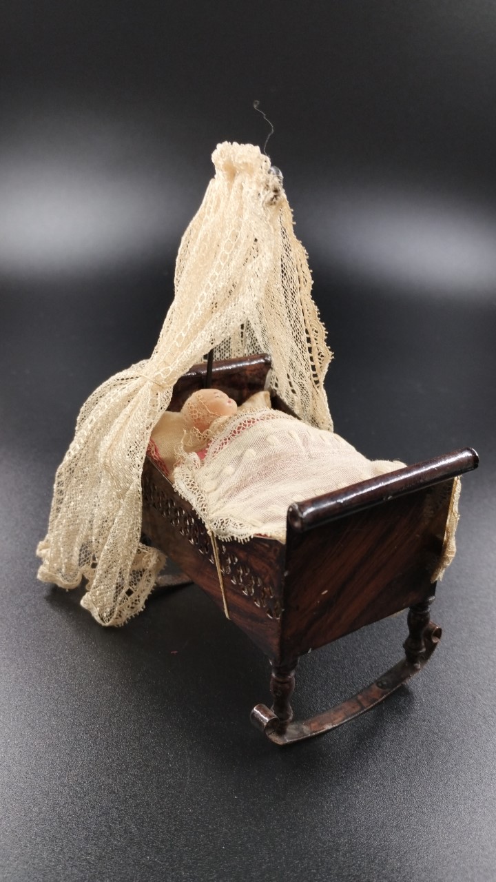 In houtimitatie gelakt, metalen schommelwiegje met b...