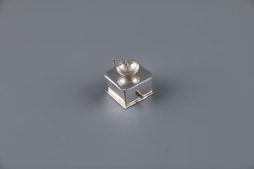 Zilveren, miniatuur schootkoffiemolen gemaakt door A...
