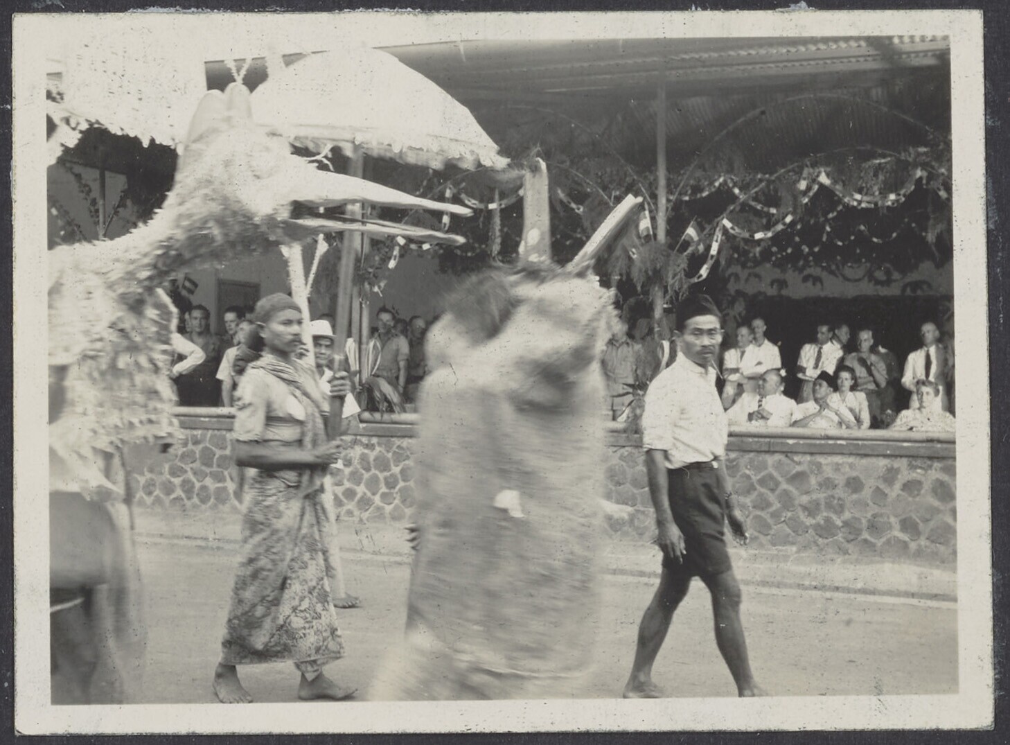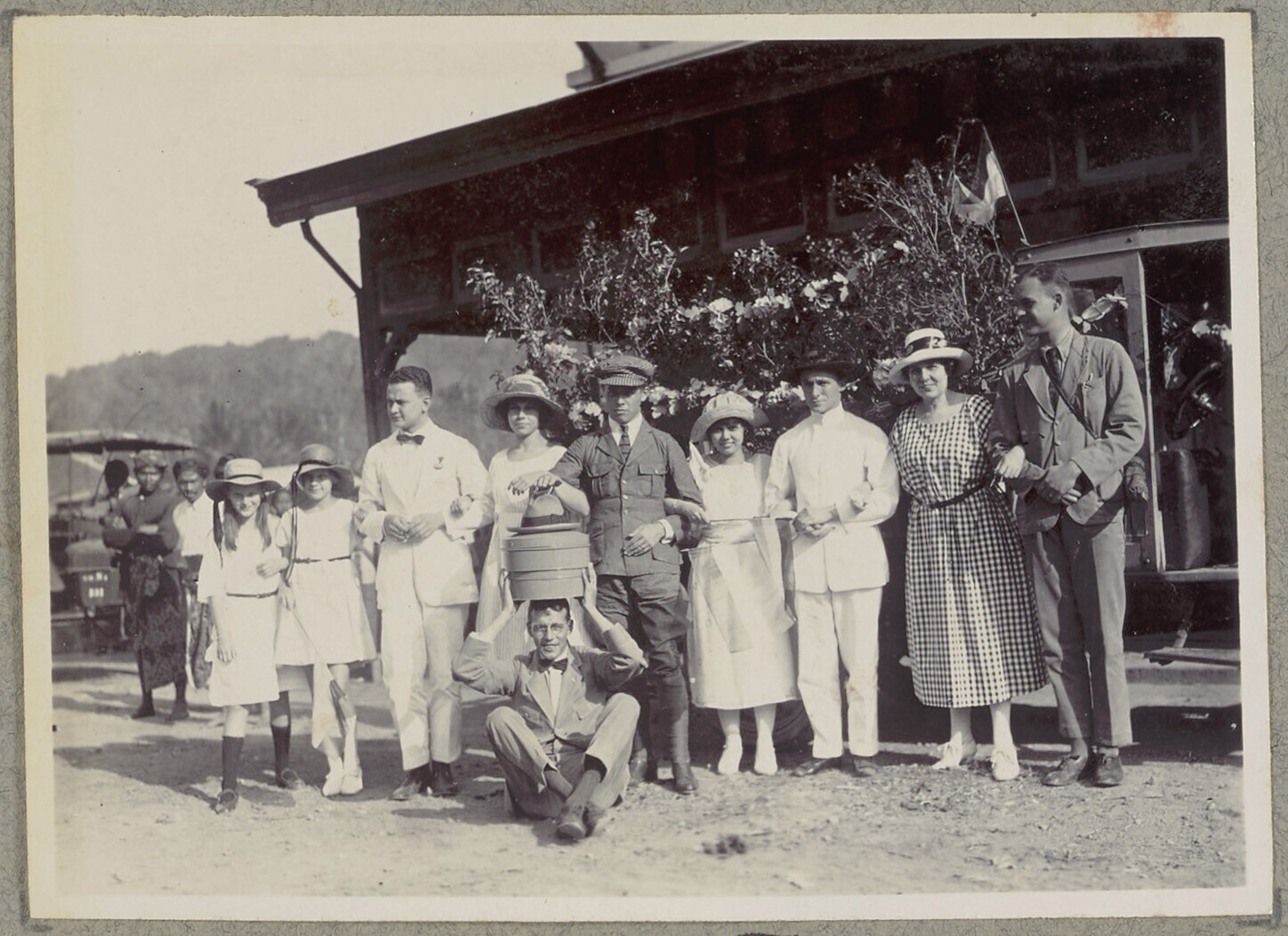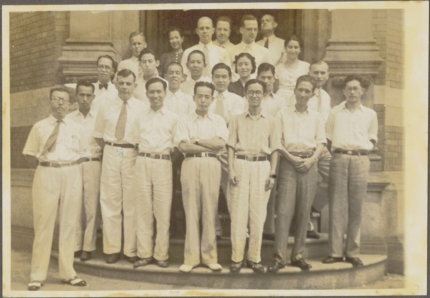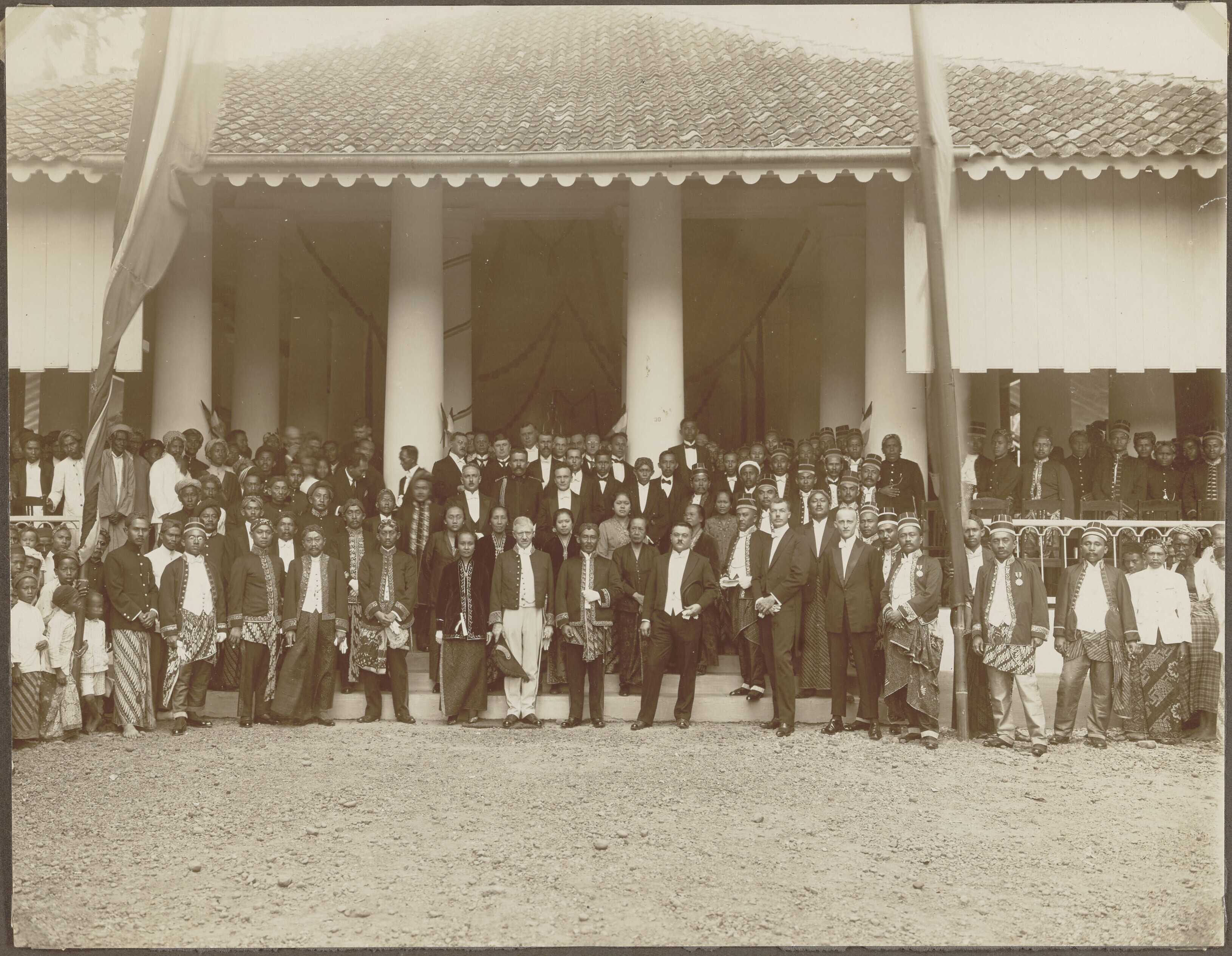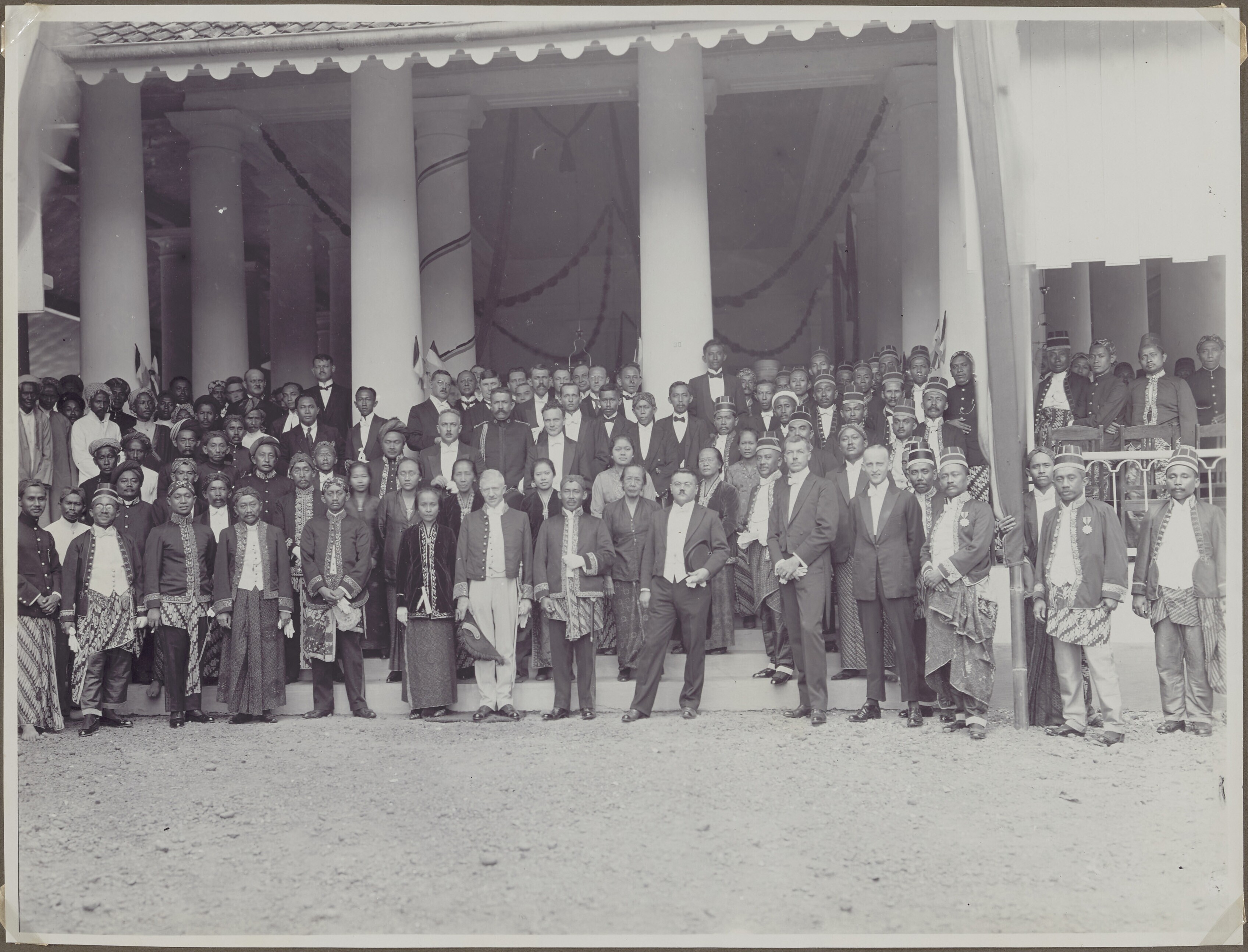 Europese en Javaanse mannen en vrouwen voor een gebouw