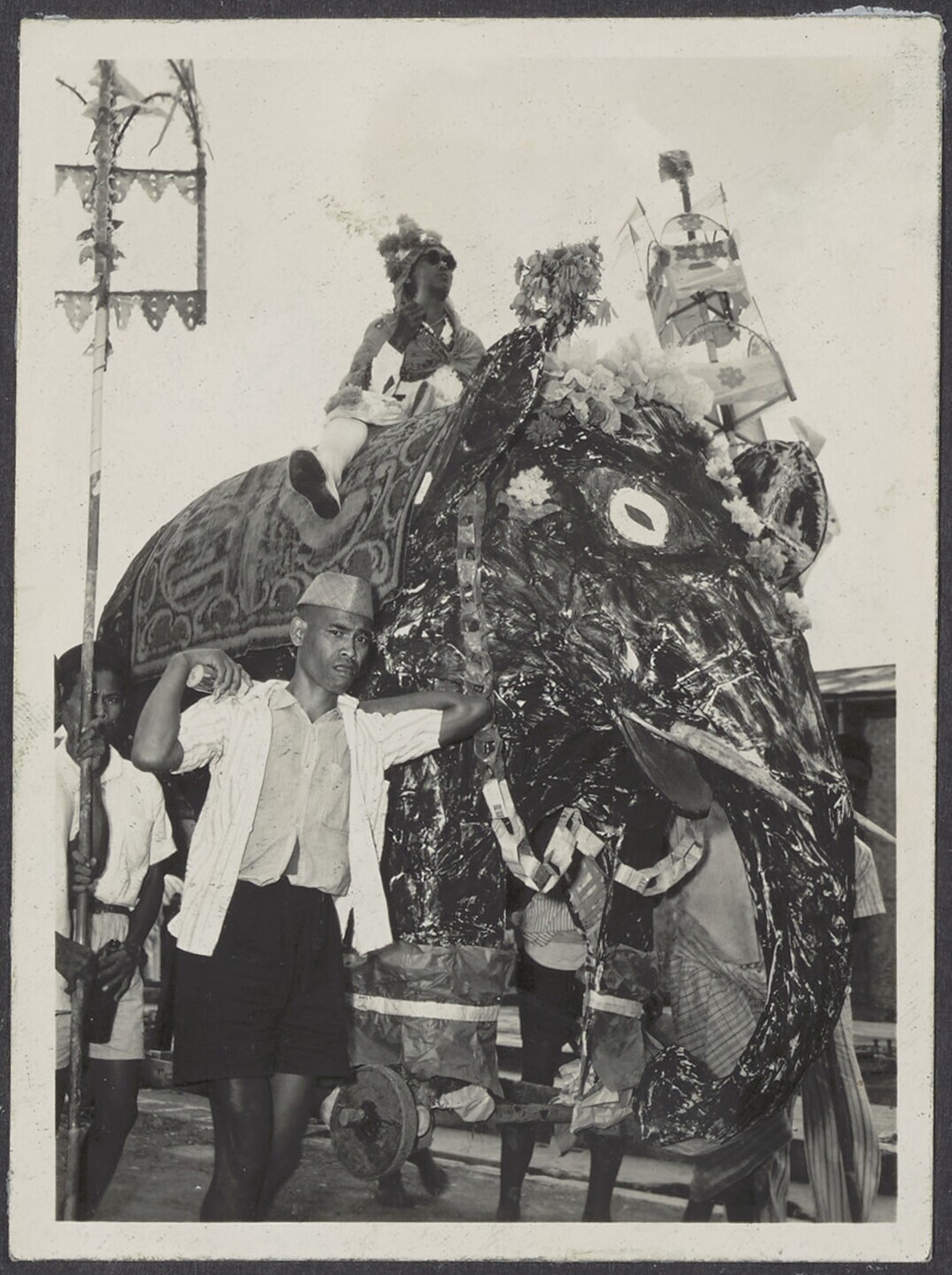 Mannen dragen een praalwagen in de vorm van een olifant