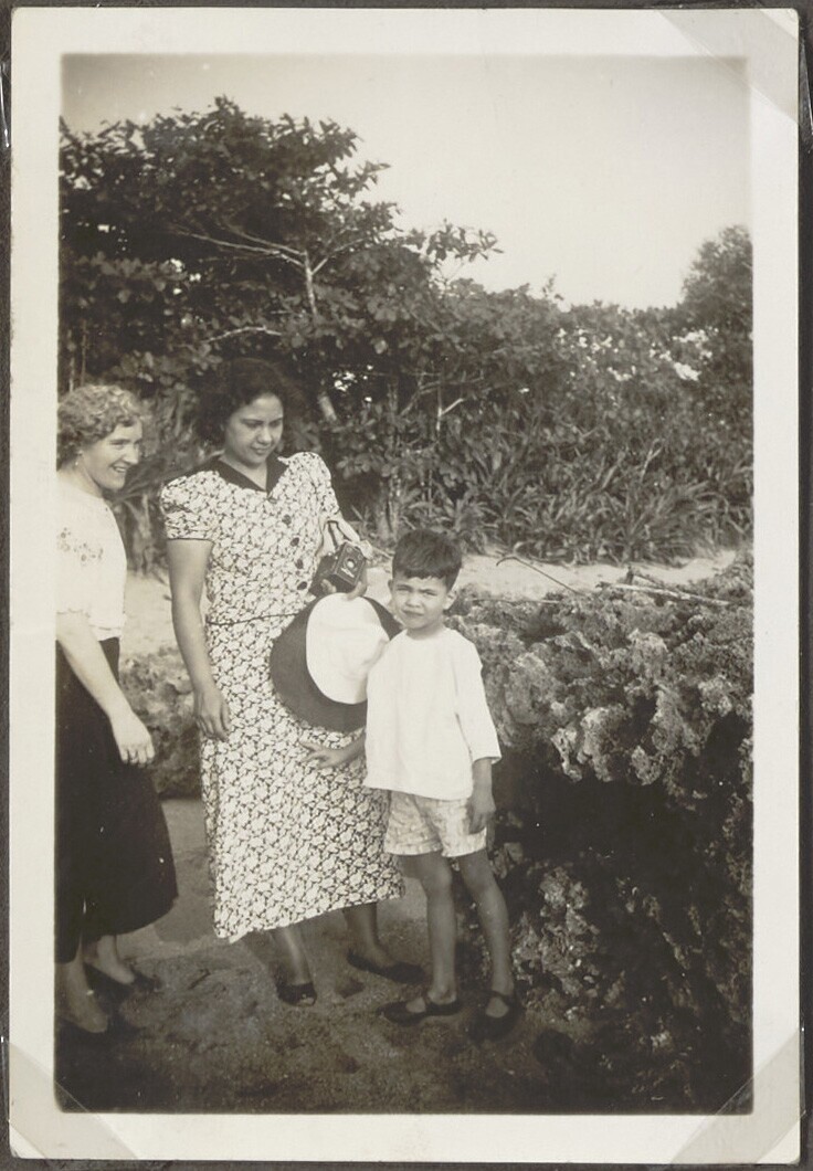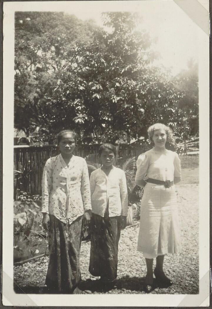 Twee Javaanse vrouwen en een Europese vrouw in een tuin