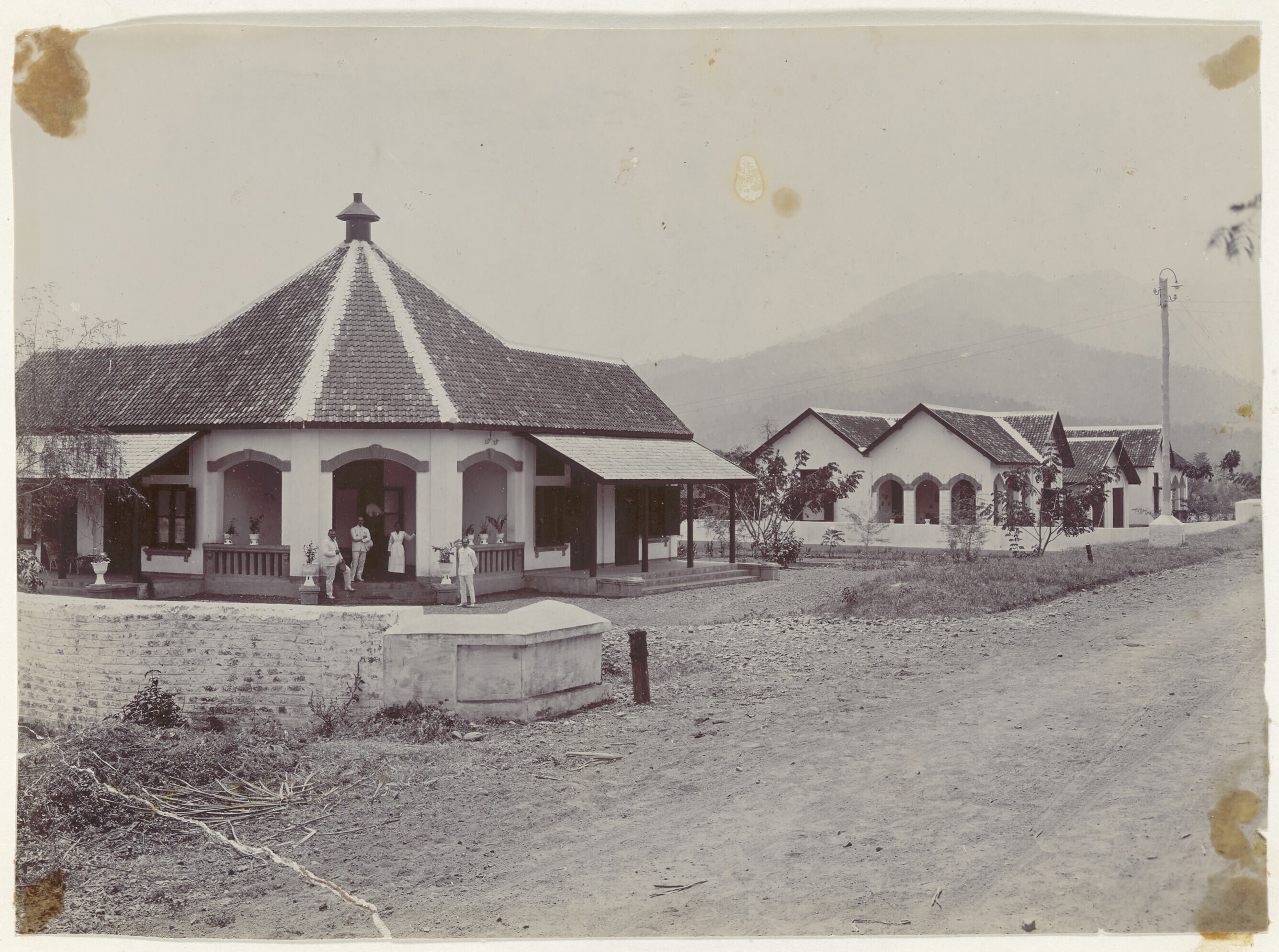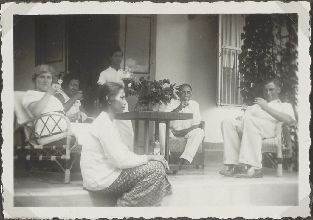 Europeanen en Javanen op de veranda van een huis dri...