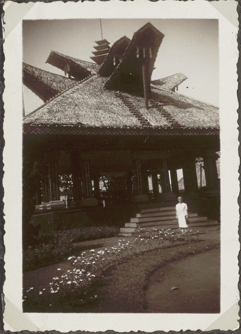 Europese vrouw voor gebouw in Javaanse stijl