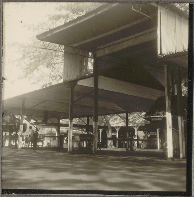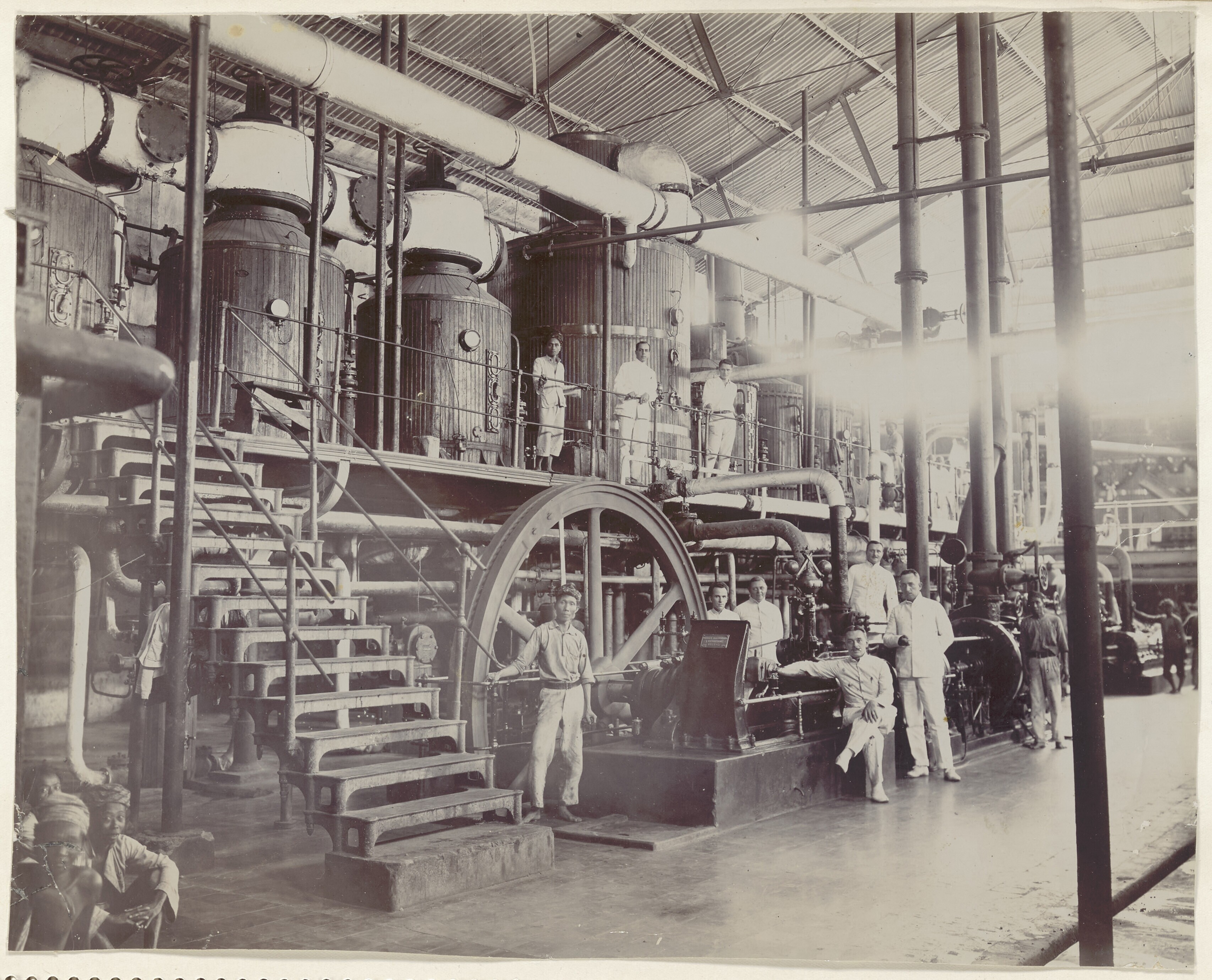 Uitzicht op machinekamer van suikerfabriek Bagoe