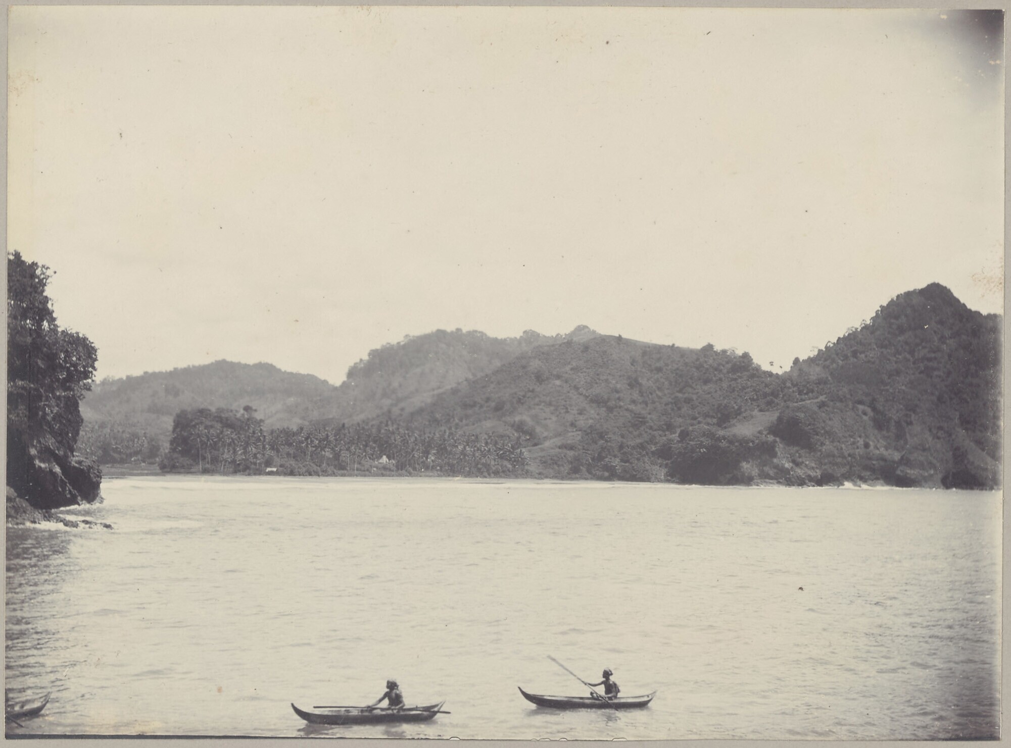Uitzicht op baai met twee kano's van Javanen in de zee