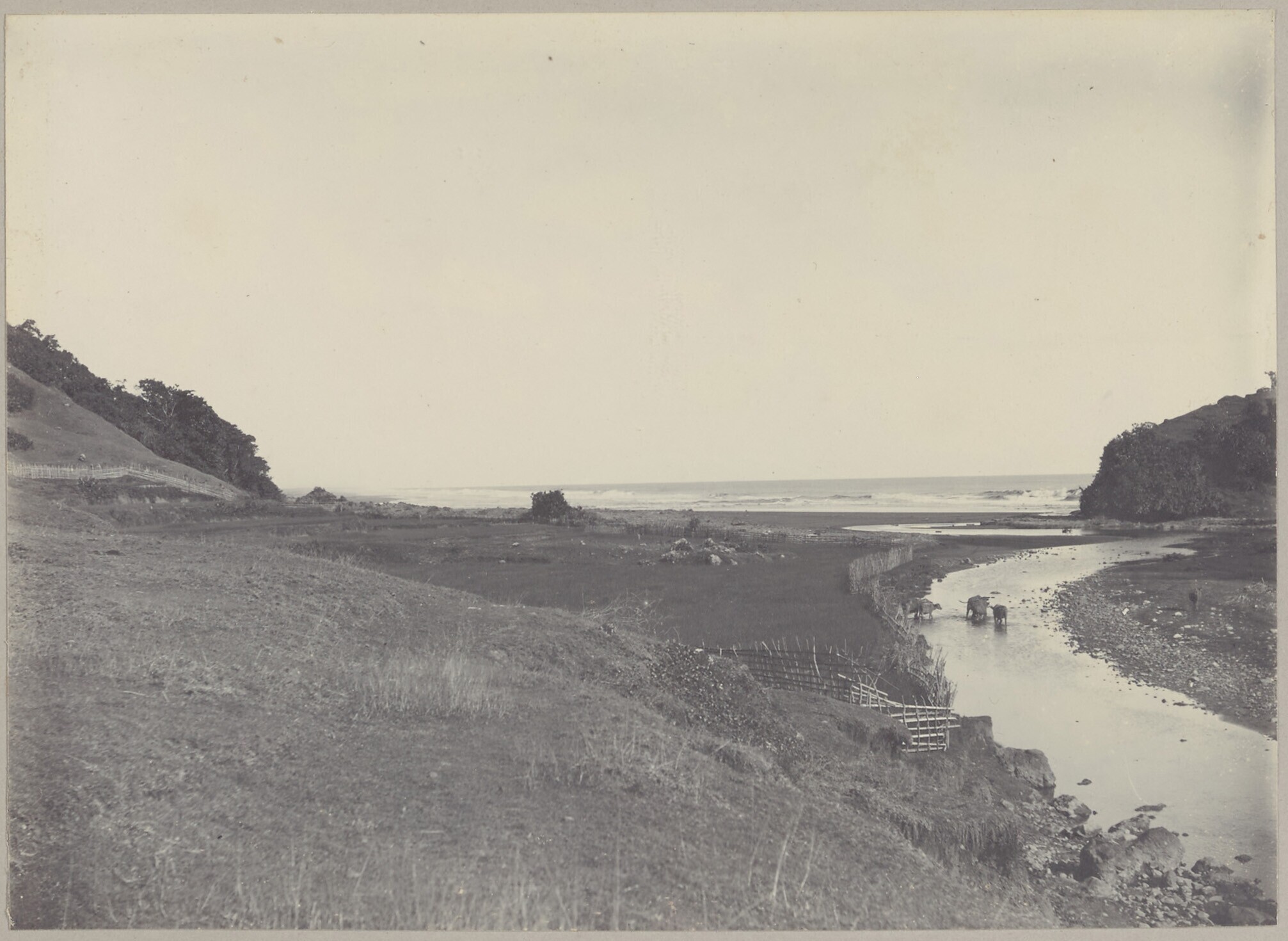 Riviermonding bij de zee met karbouwen in de rivier ...