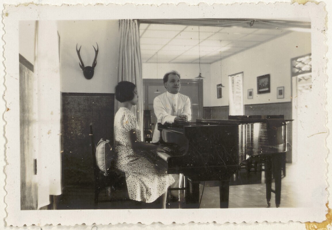 Portret van Jan Verburg tijdens de pianoles aan een ...