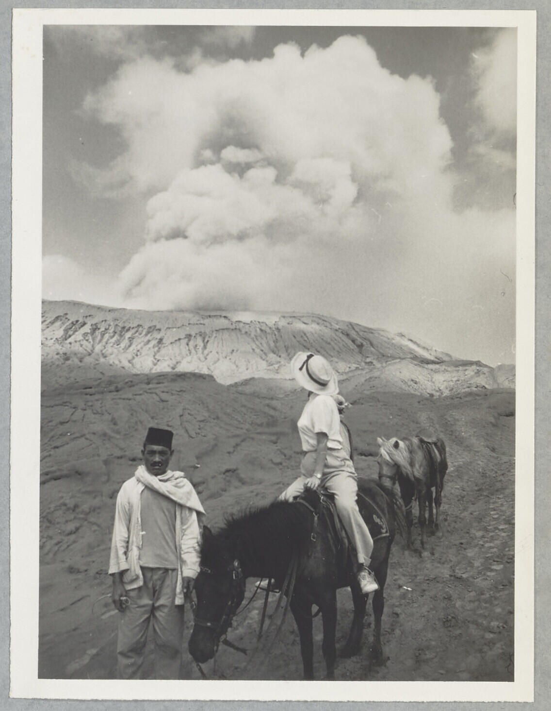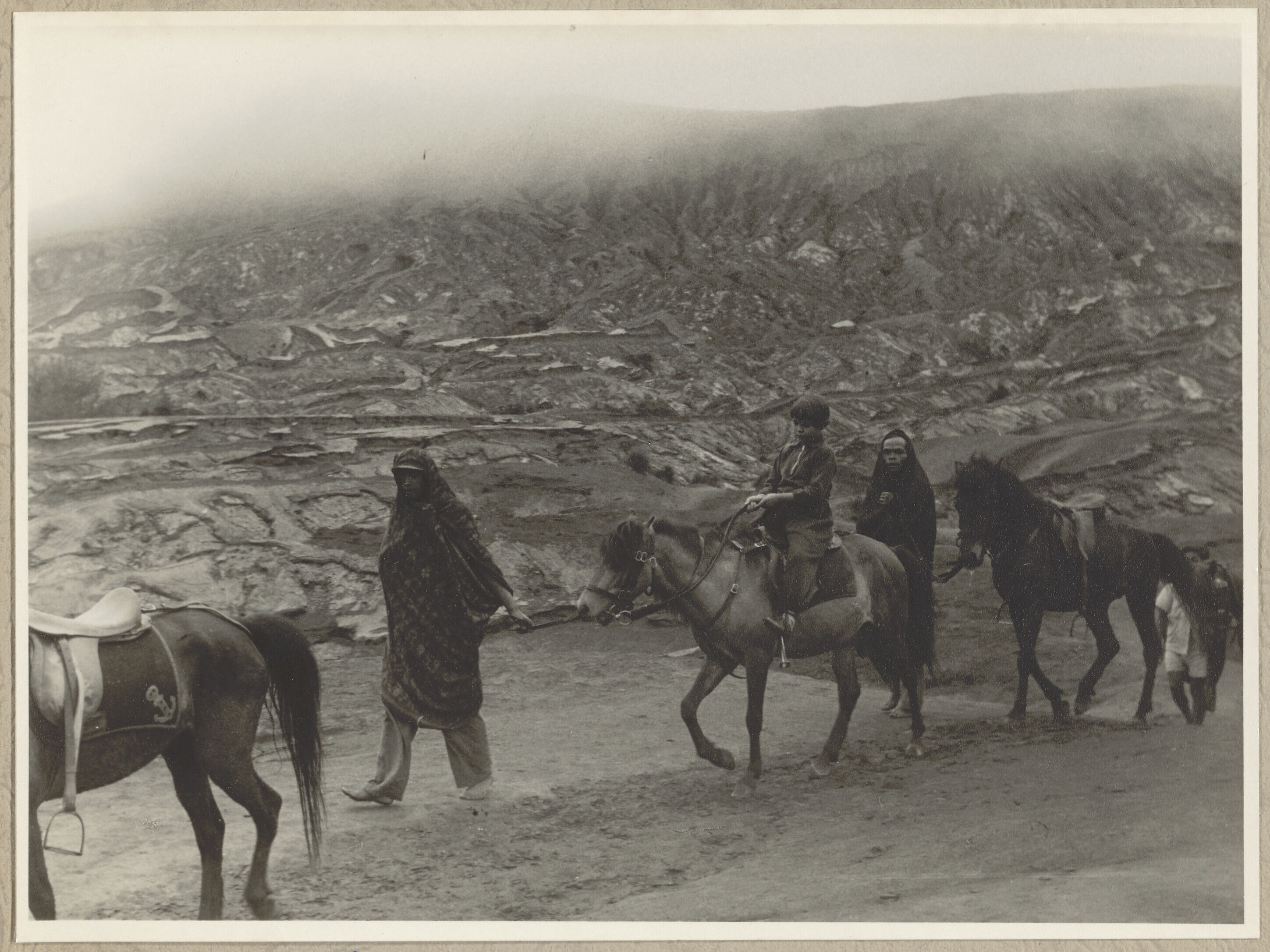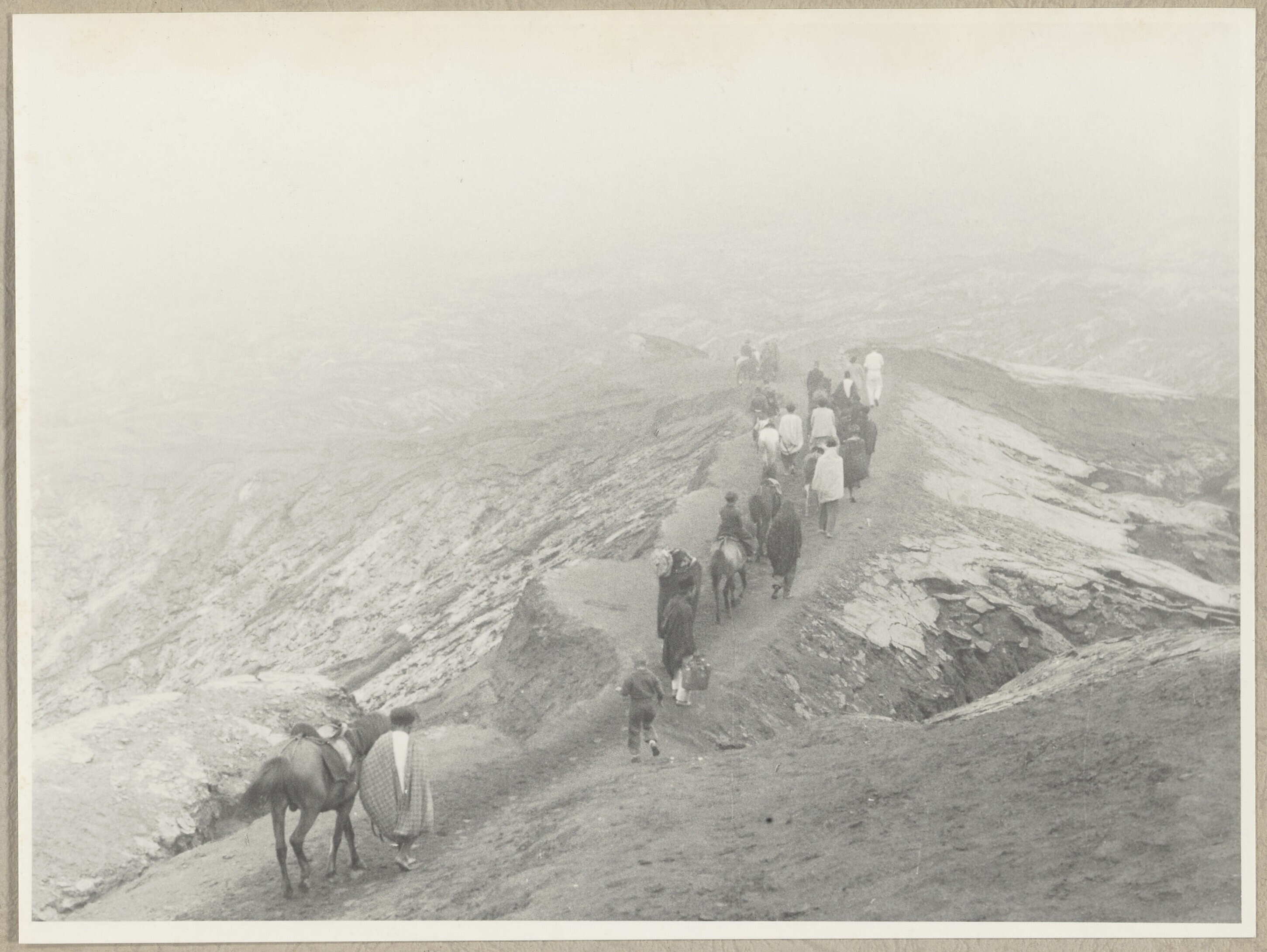 Mensen met paarden die op weg zijn naar de vulkaan B...