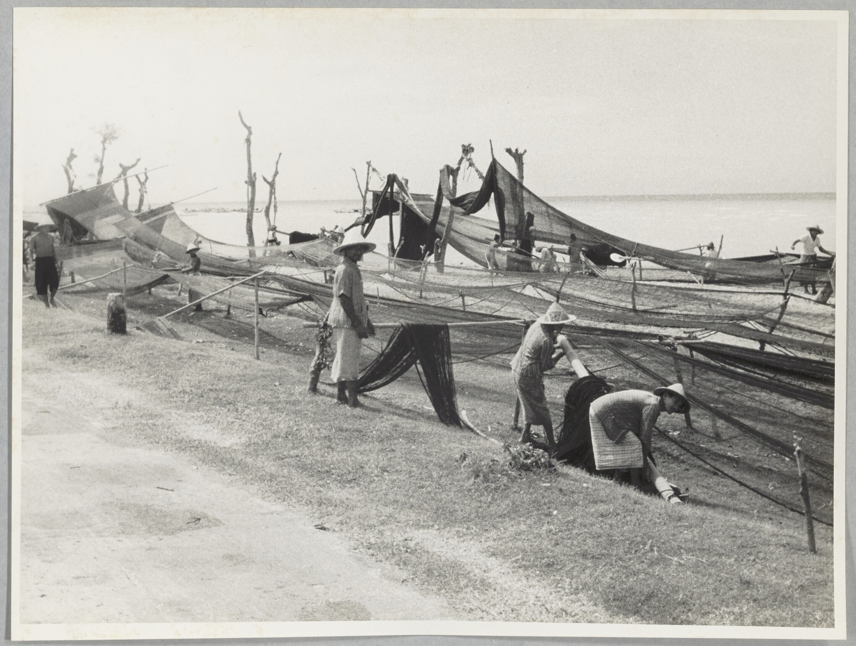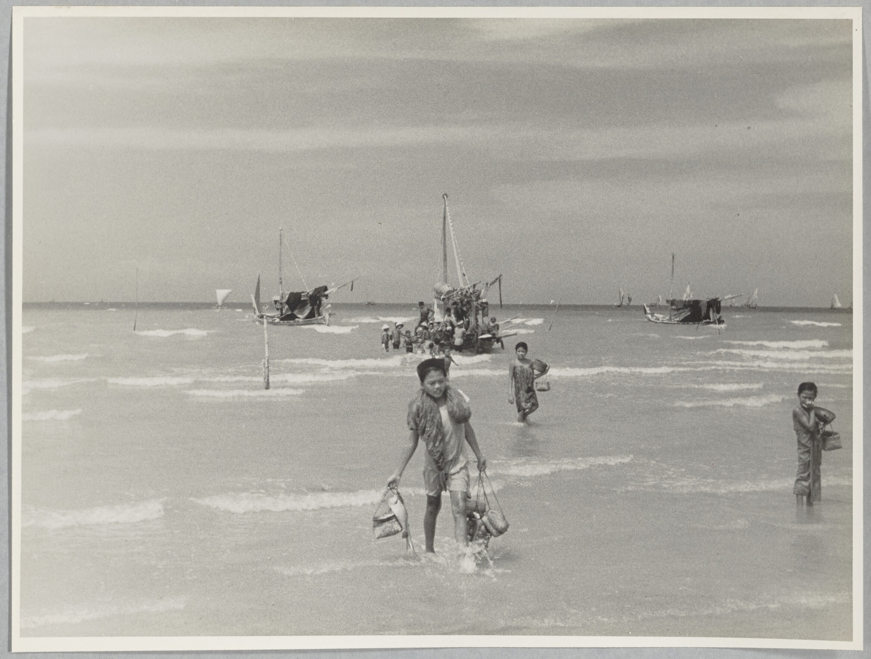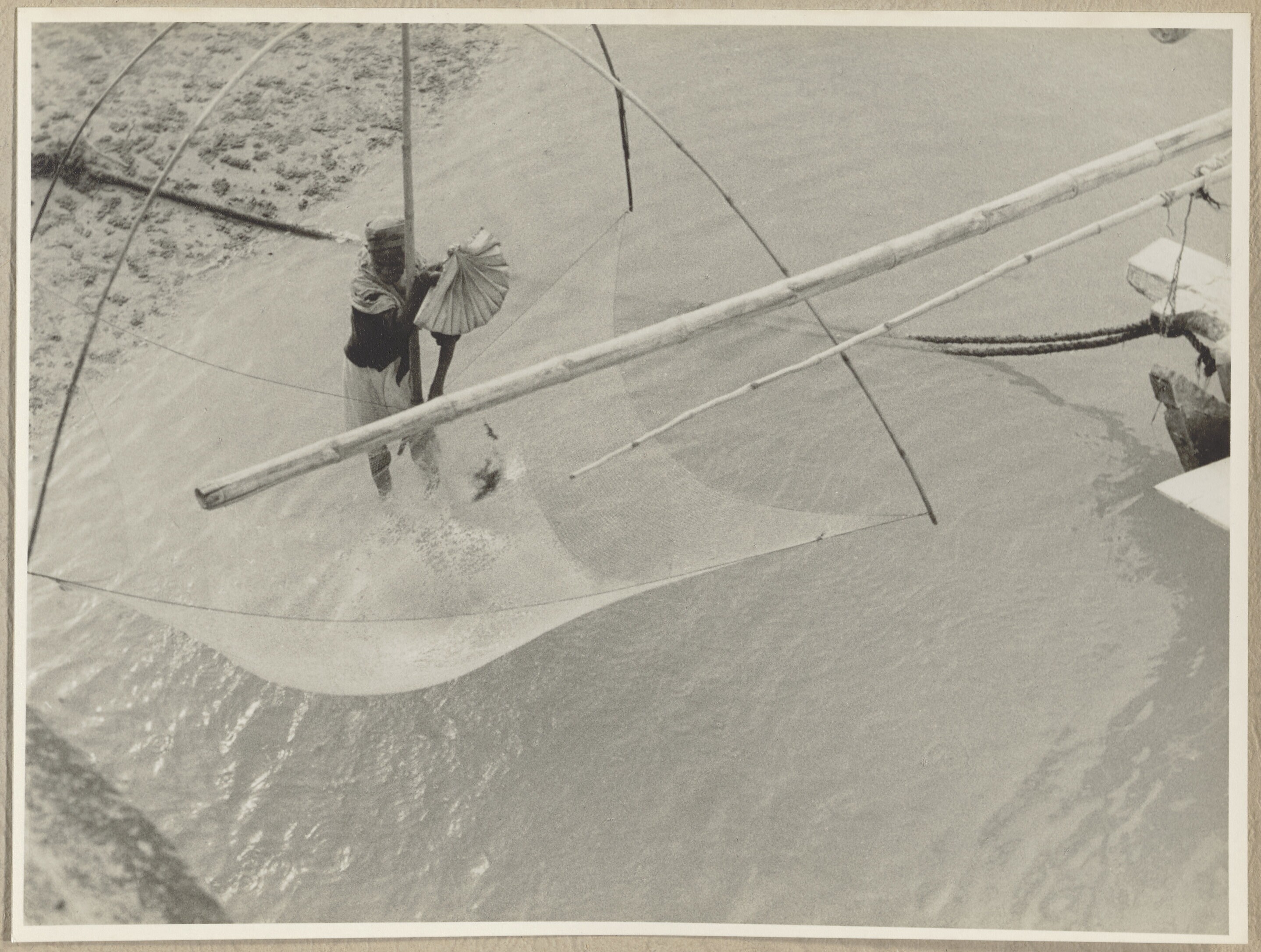 Een Javaanse jongen die vis en andere spullen uit ee...