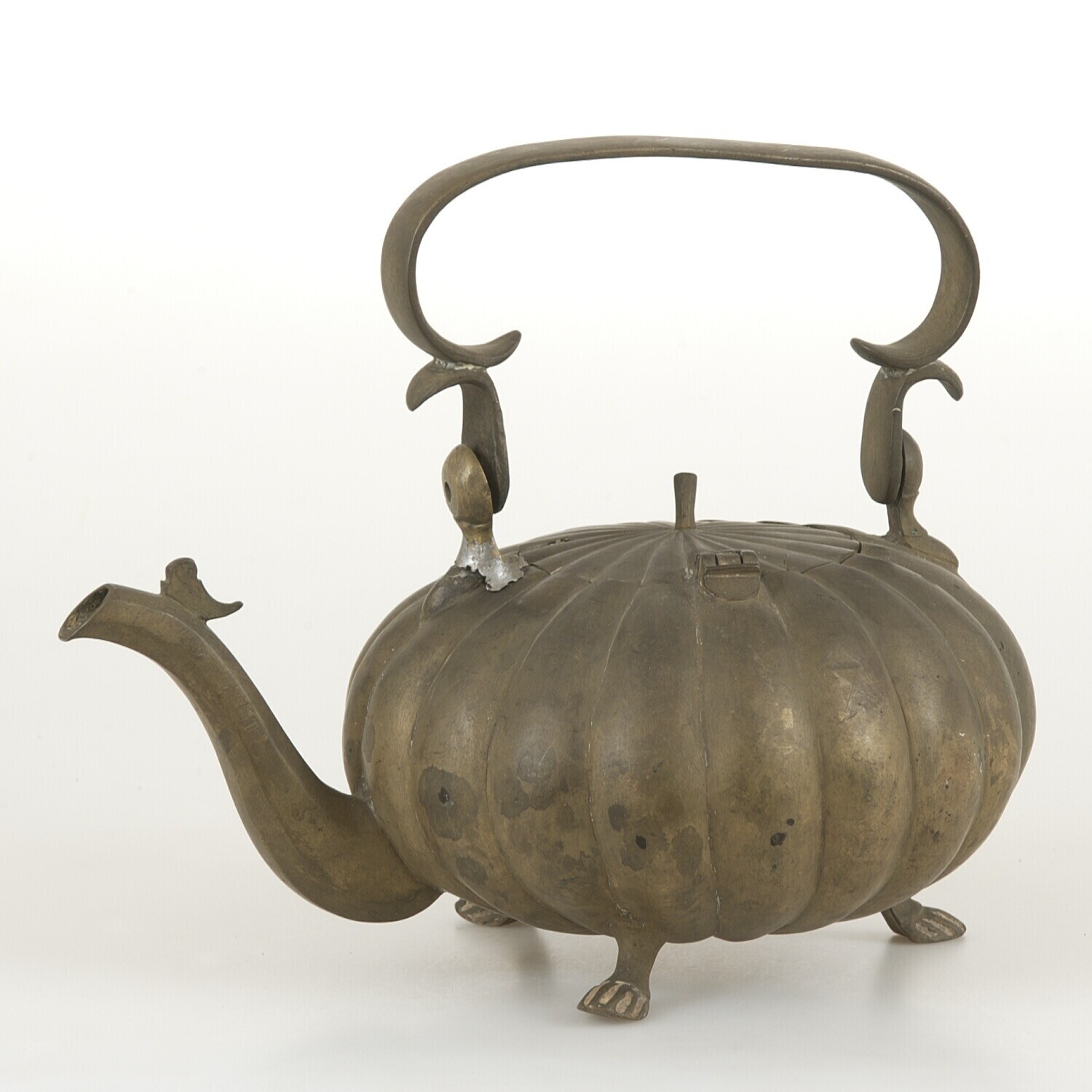 Bamboe opiumpijp met aardewerken kop en koperen plaat