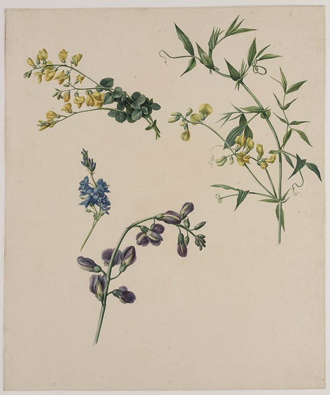 Vier verschilldende bloesems. Lathyrus en Scilla